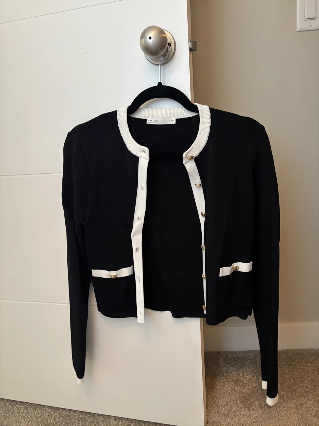 This is an Oak + Fort black and white cardigan. It features a classic crew neck and gold button closures. The contrast trim adds a stylish touch. Looks brand new! Size small.