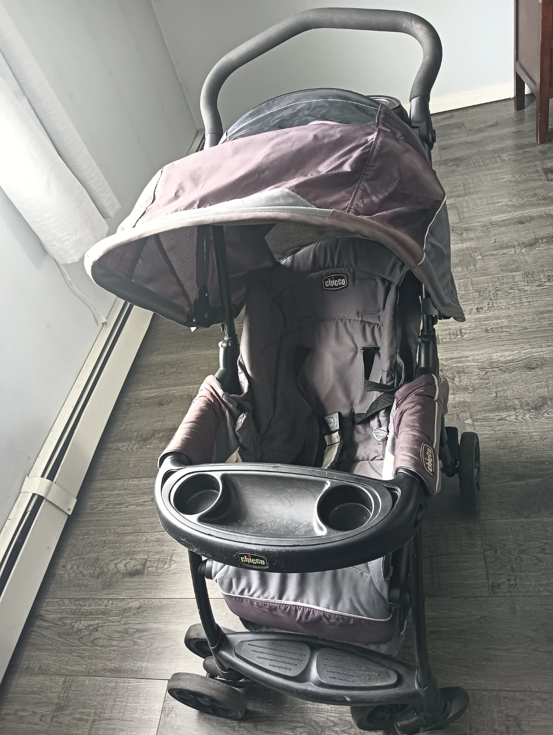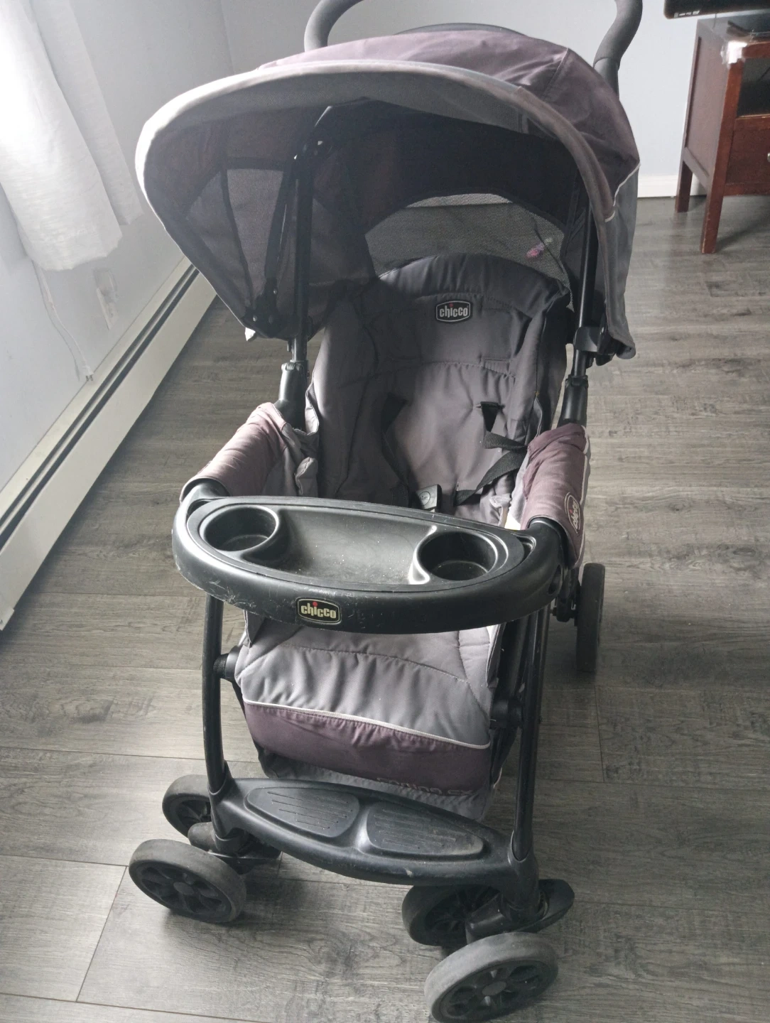 This is a Chicco stroller. It has a canopy and a tray with cup holders. The stroller has a grey and purple colour scheme.