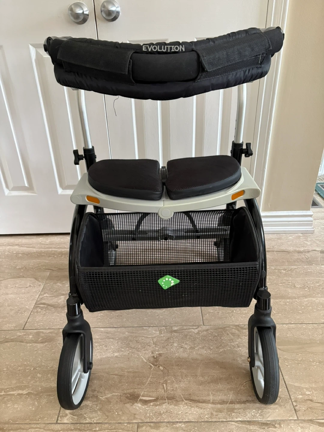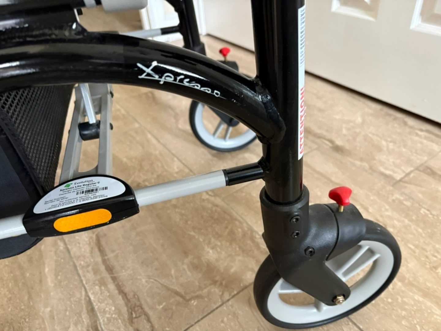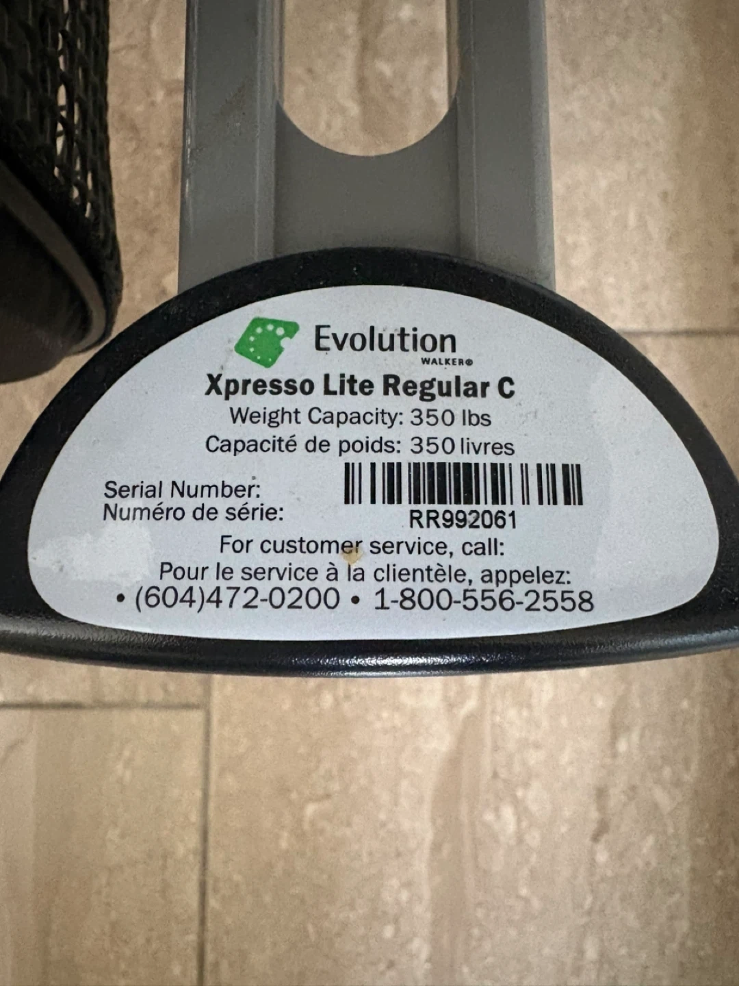 This Evolution walker is the Xpresso Lite Regular C model with cable free brakes. It has a weight capacity of 350 lbs. Includes a basket for storage. It's a great mobility aid for getting around!