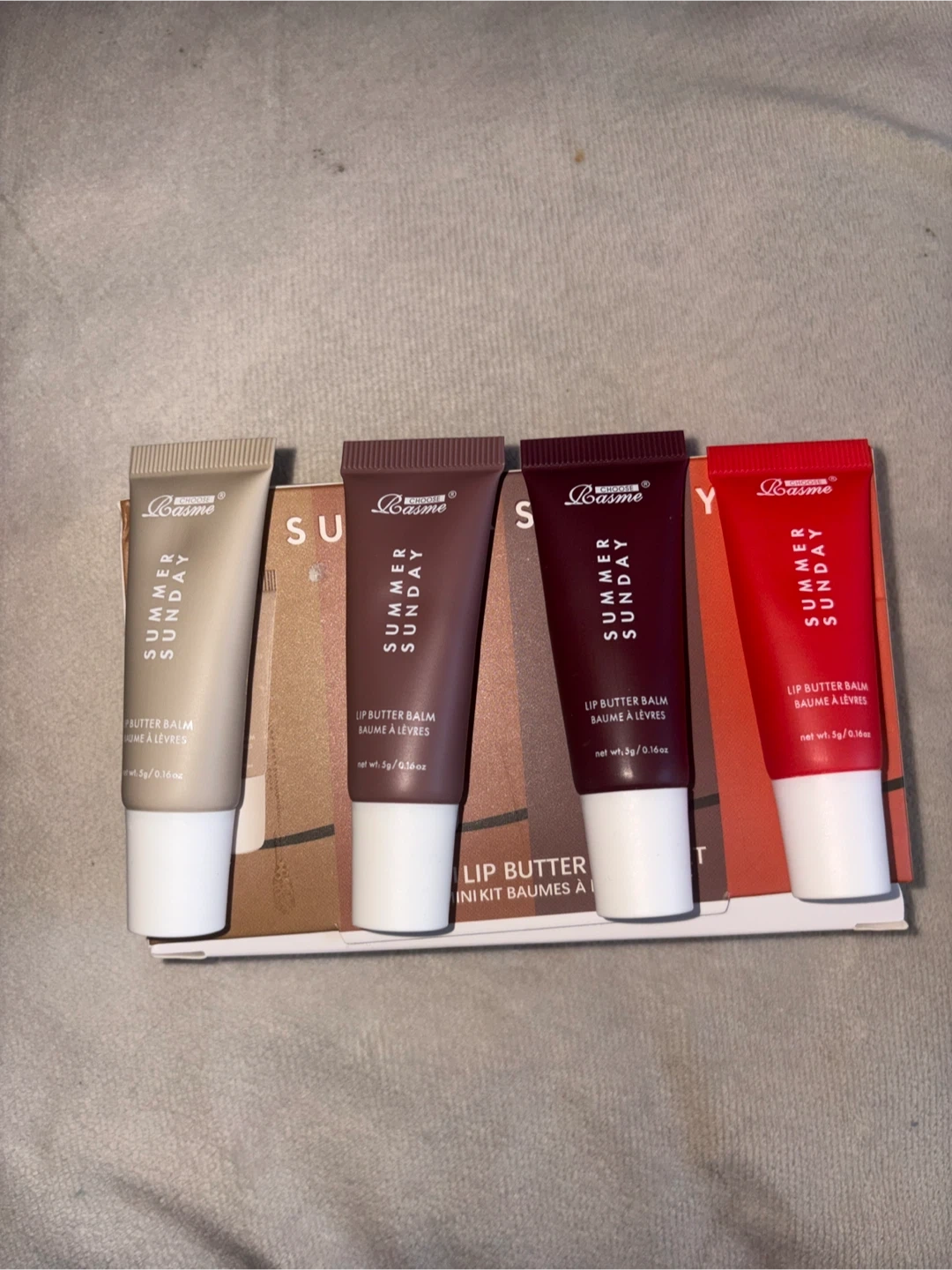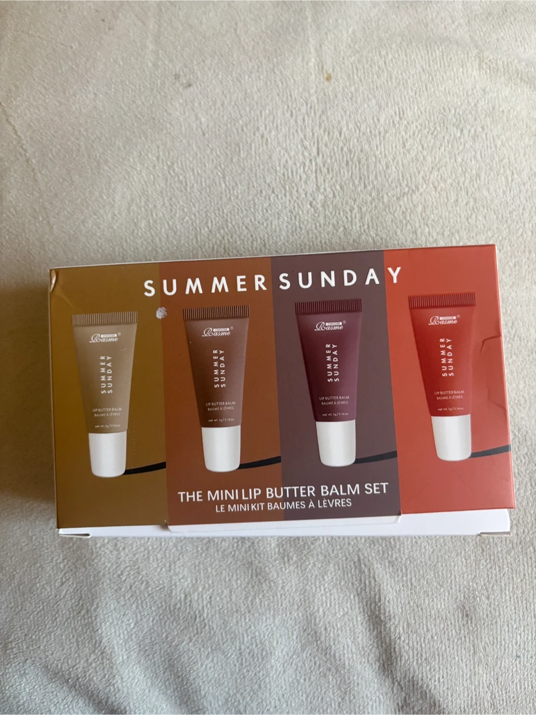 Selling a brand new Summer Sunday Lip Butter Balm Mini Kit! This set includes four different tinted balms to keep your lips moisturized and radiant. Each balm is 100% vegan and soothes dry lips. The kit includes the box