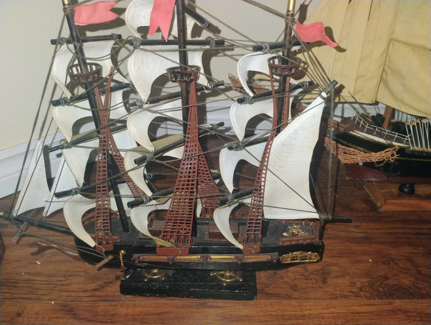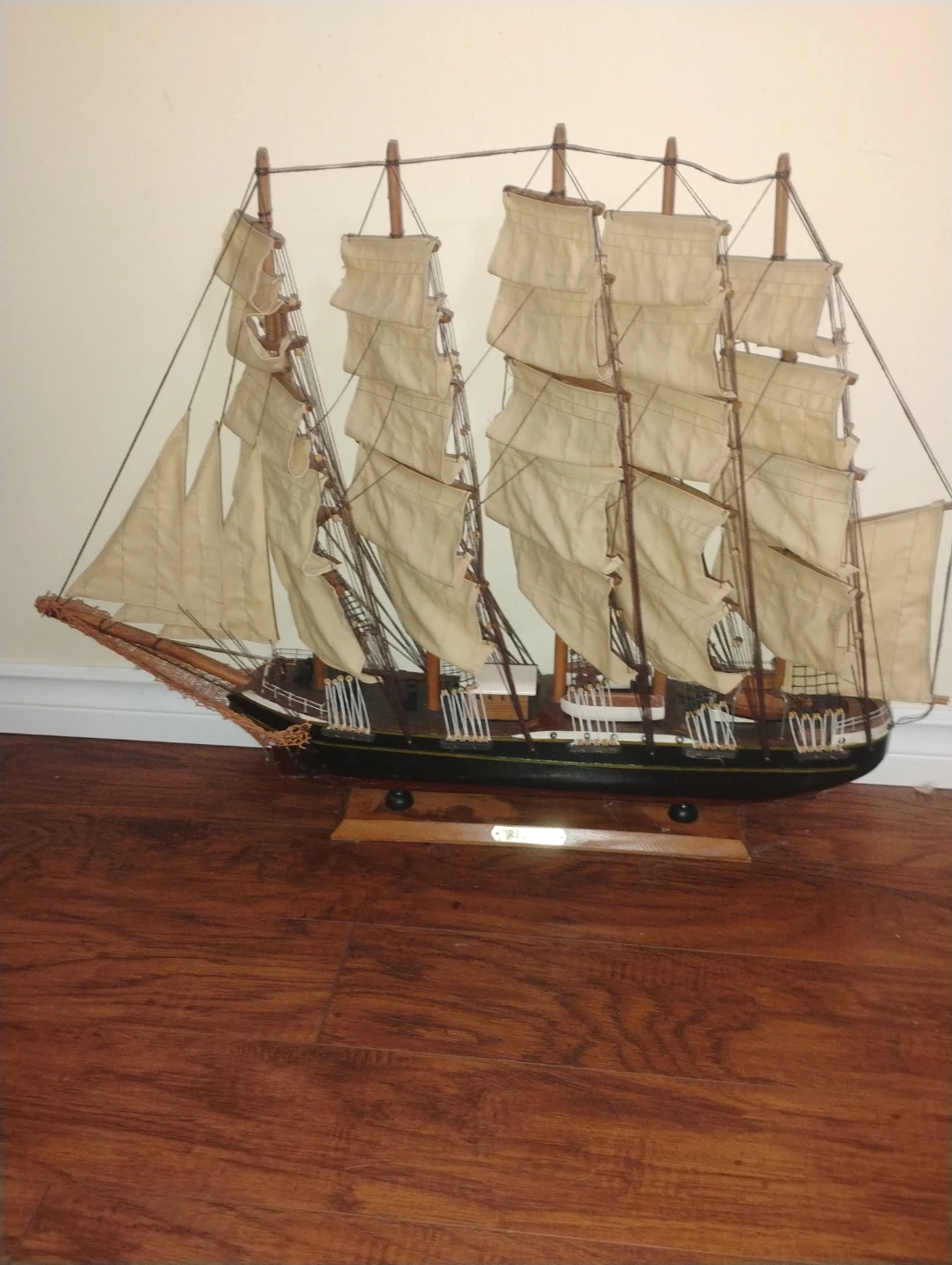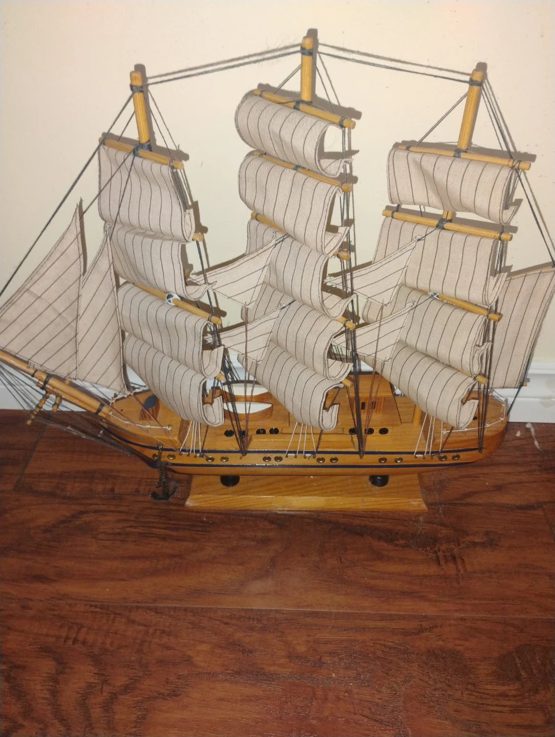 A detailed model of a sailing ship, complete with sails and rigging. Made from wood and fabric components. This decorative piece would be a nice addition to a study or living room.