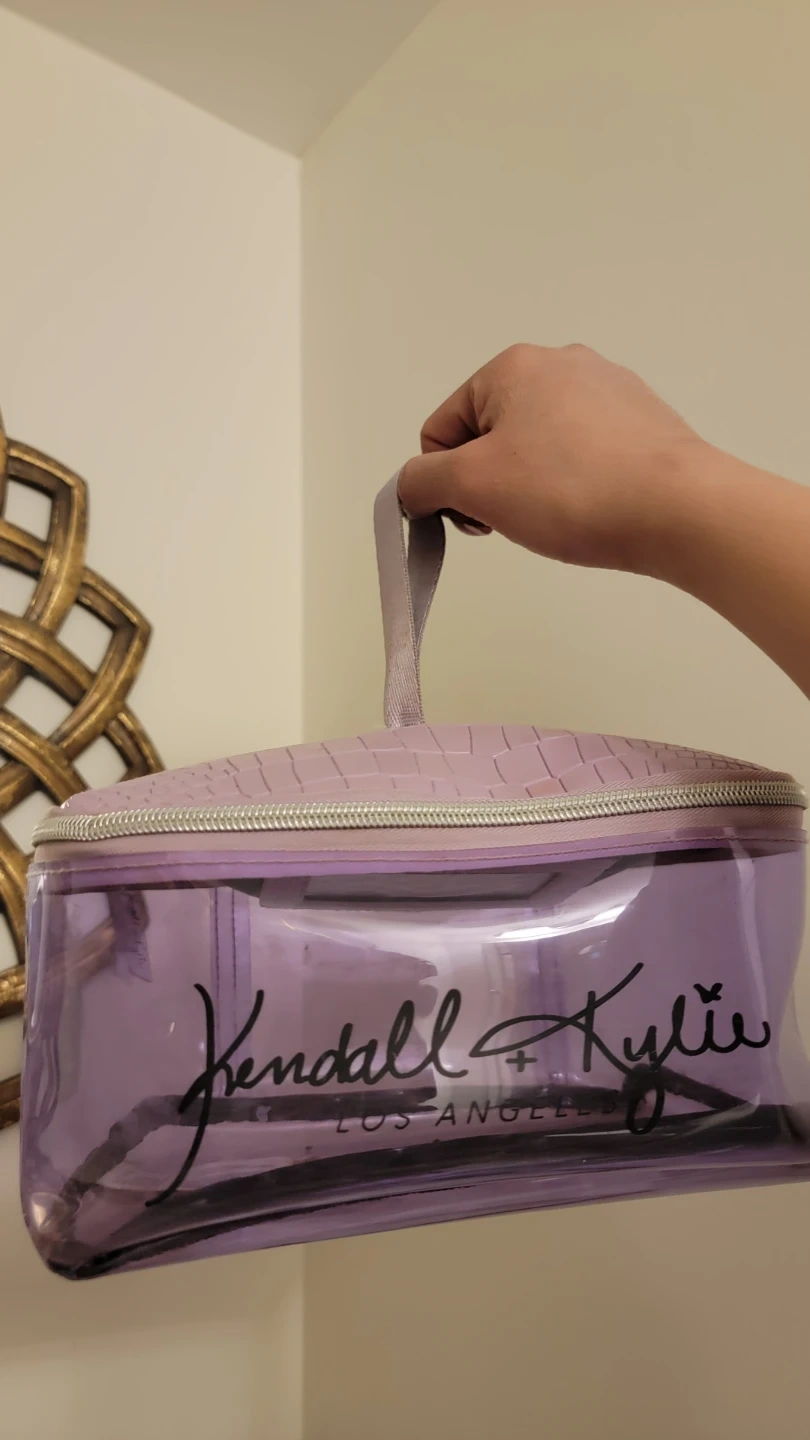 A Kendall + Kylie cosmetic bag in a fun purple transparent material. It's great for keeping your makeup and toiletries organized on the go. The faux crocodile trim adds a stylish touch!