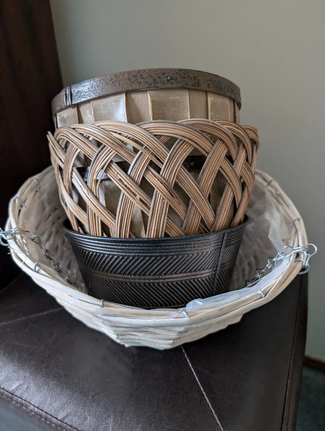 This is a set of three decorative baskets and one hanging basket. Perfect for planters or storage! Selling all together. Some new. Some used.