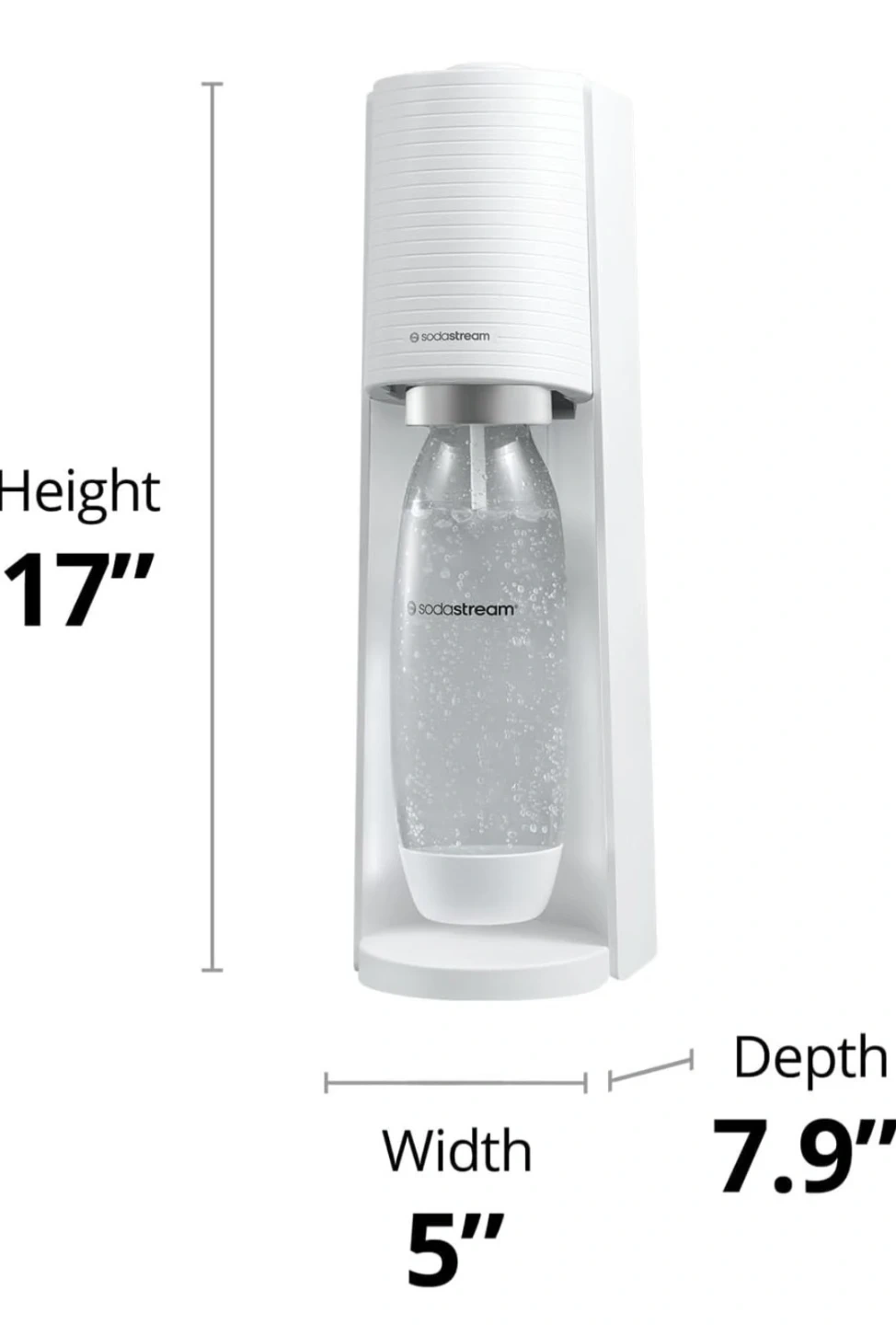 This is a red SodaStream Terra sparkling water maker. It's a kitchen appliance for carbonating water. It includes the carbonator unit, a reusable 1-liter bottle, and a CO2 cylinder. The carbonator measures 17 inches high, 5 inches wide, and 7.9 inches deep. New, never used.
