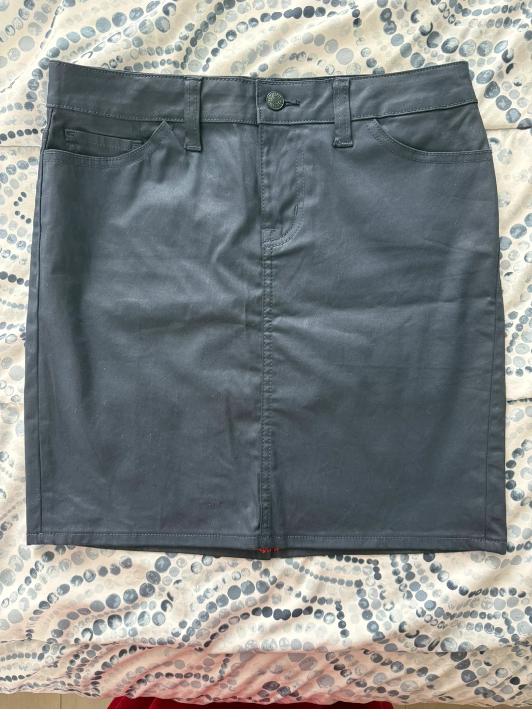 It features a classic five-pocket design and a button and zipper closure. This skirt is perfect for everyday wear.