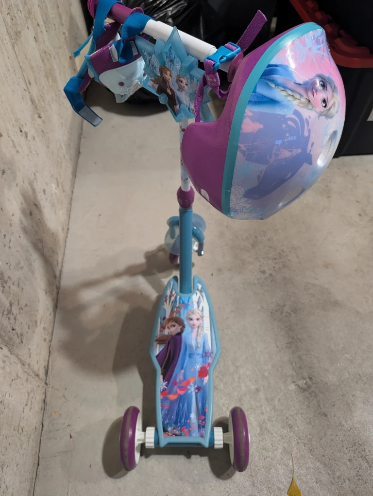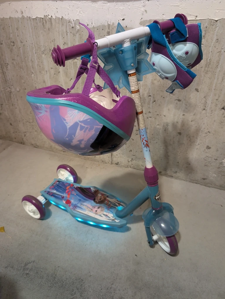 This is a Disney Frozen themed scooter and helmet set. The scooter has three wheels and the helmet features characters from the movie. It's perfect for young riders learning to balance. The set includes knee pads for added safety.