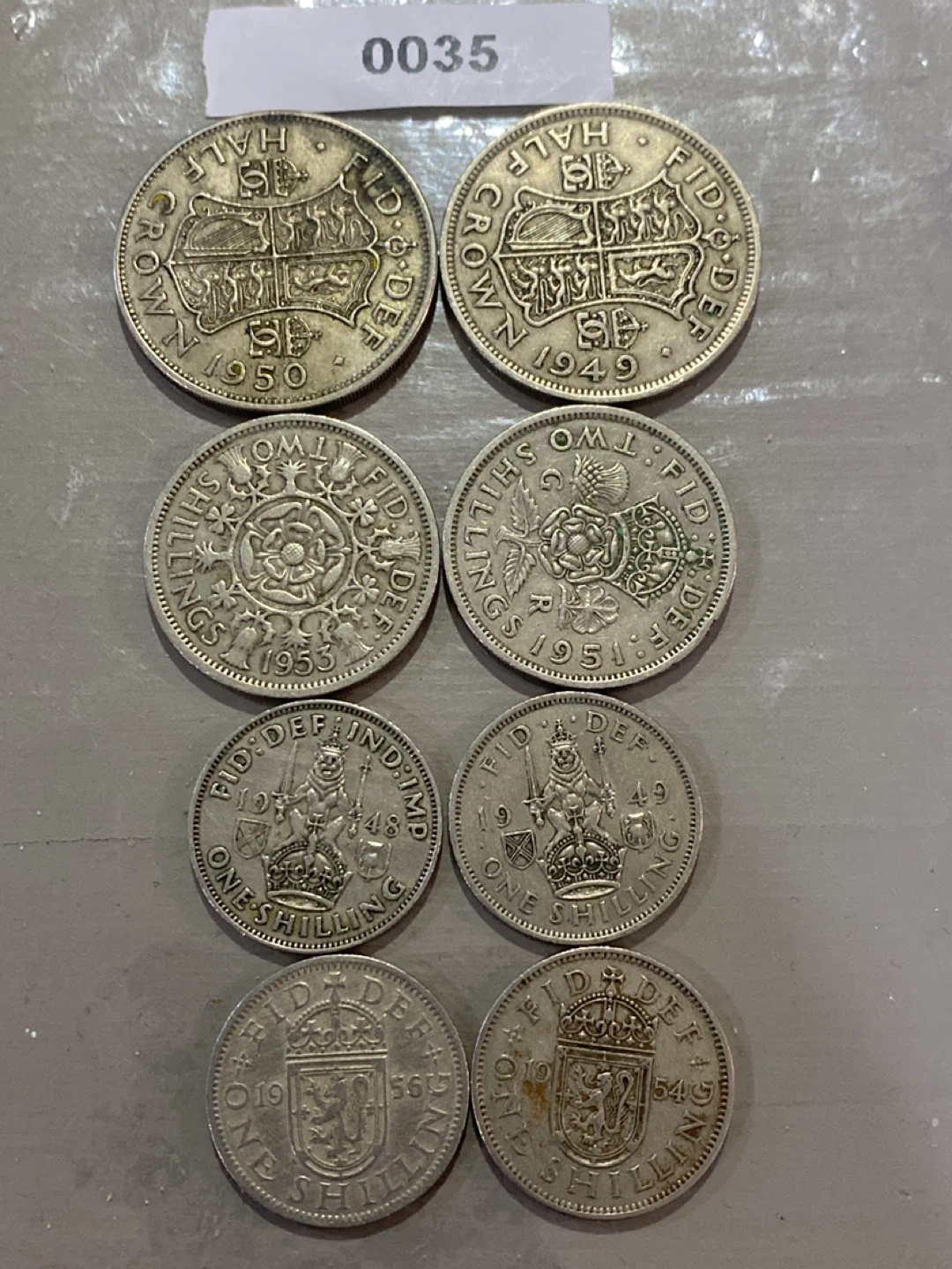A collection of various British coins. Includes half crowns, two shillings, and one shilling denominations. Dates range from 1948 to 1954. These coins are great for collectors or for educational purposes.