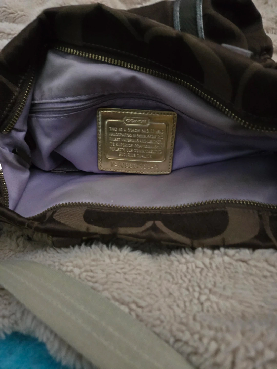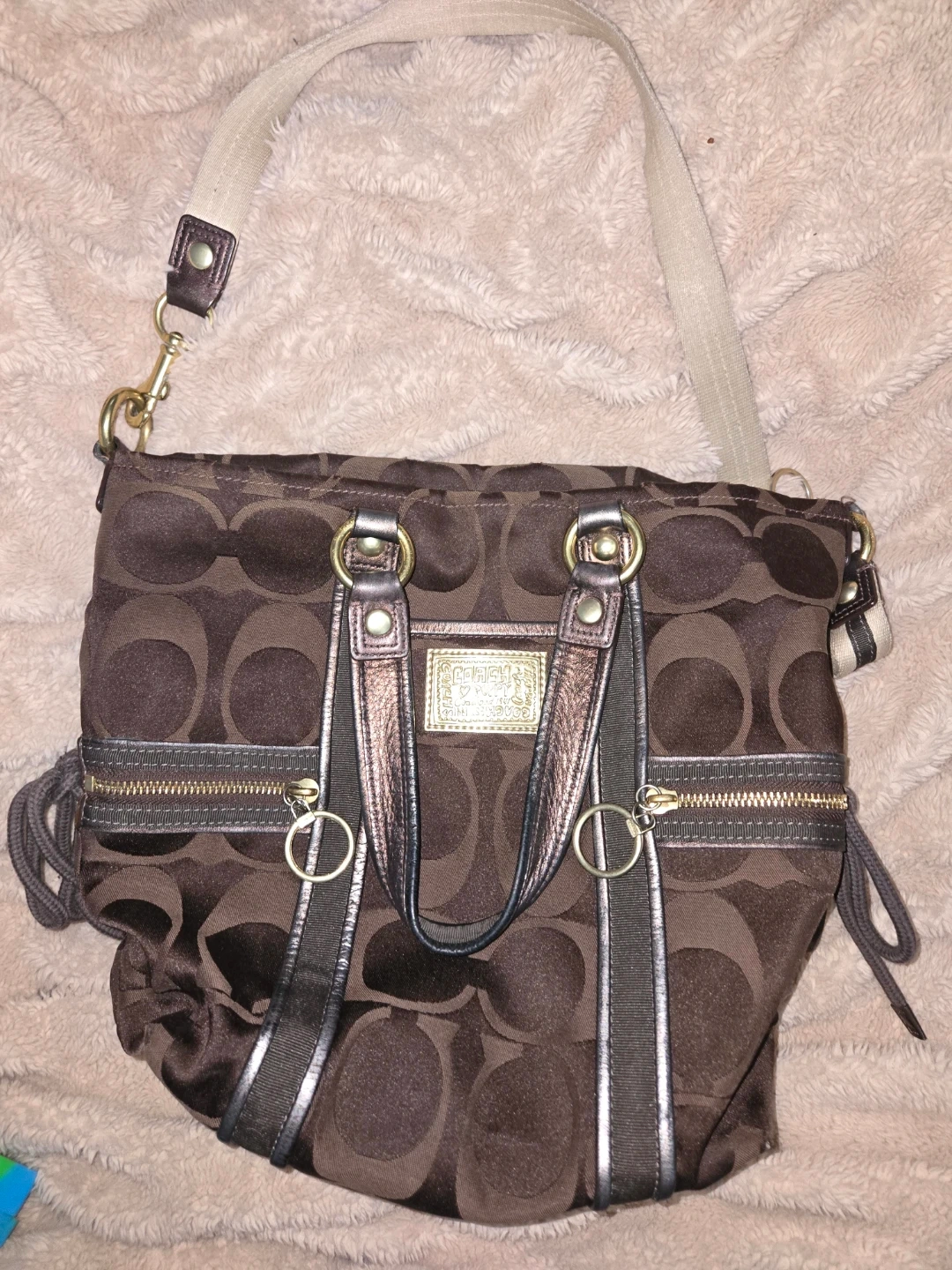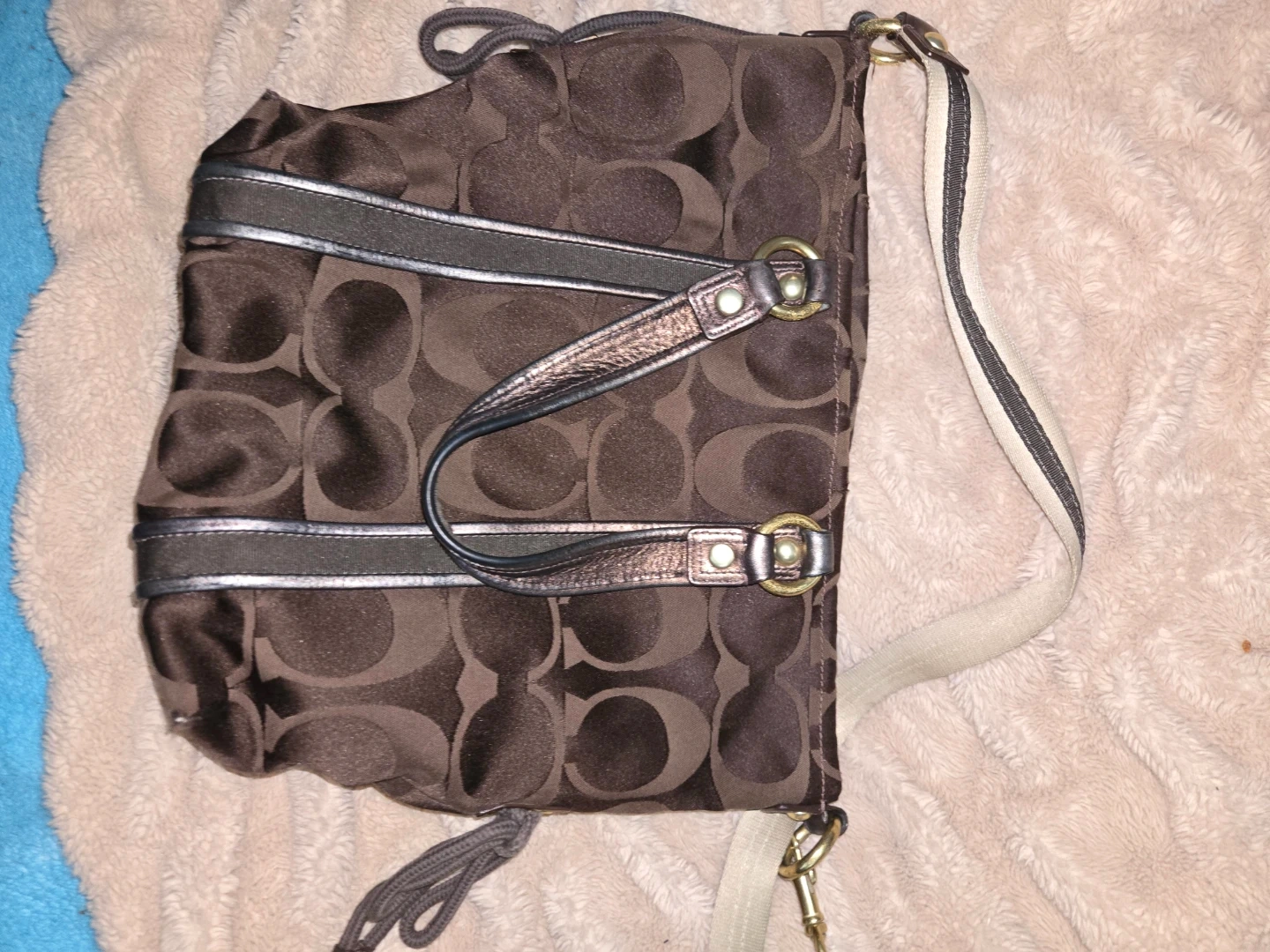 This is a Coach bag made from signature monogram canvas. It features dual top handles and a detachable shoulder strap. It's a stylish accessory for everyday use!