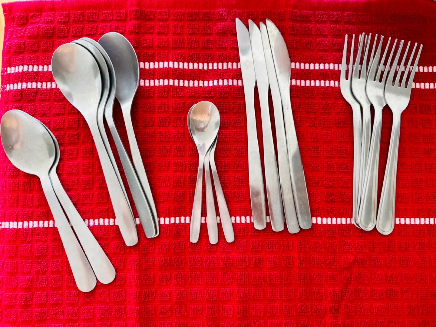 A set of stainless steel cutlery, including 4 forks, 4 knives, and 6 large spoons + 3 small spoons.These utensils are made of durable stainless steel. Selling as I am moving out.