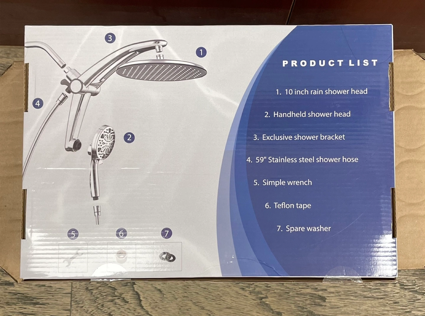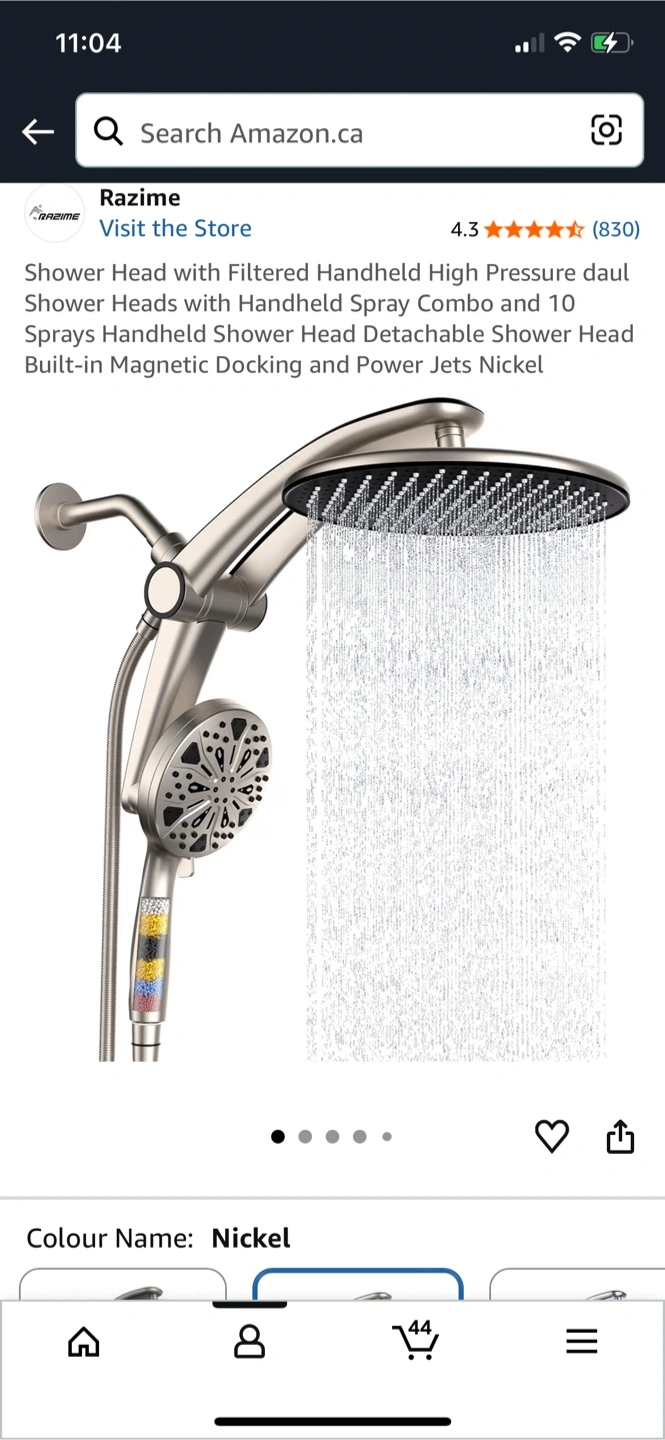 This is a Razime rain shower head combo in nickel finish. It includes a 10-inch rain shower head and a handheld shower head. The package also contains an exclusive shower bracket, a 59-inch stainless steel shower hose, a simple wrench, Teflon tape, and a spare washer. Magnetic docking and power jets are included.