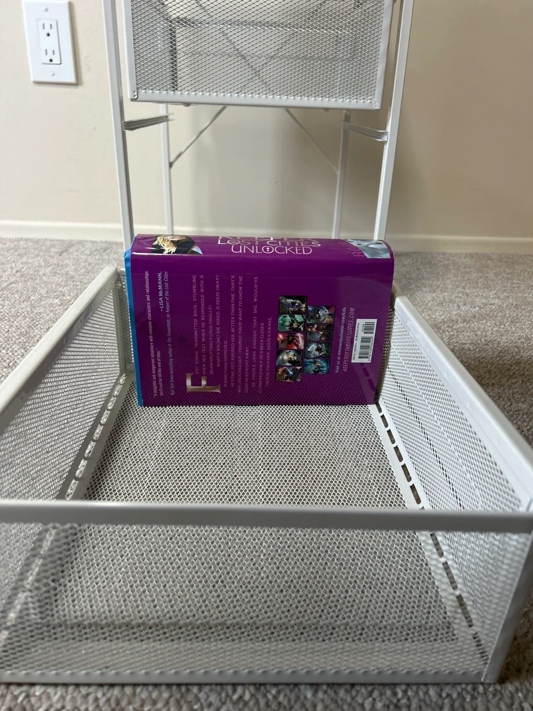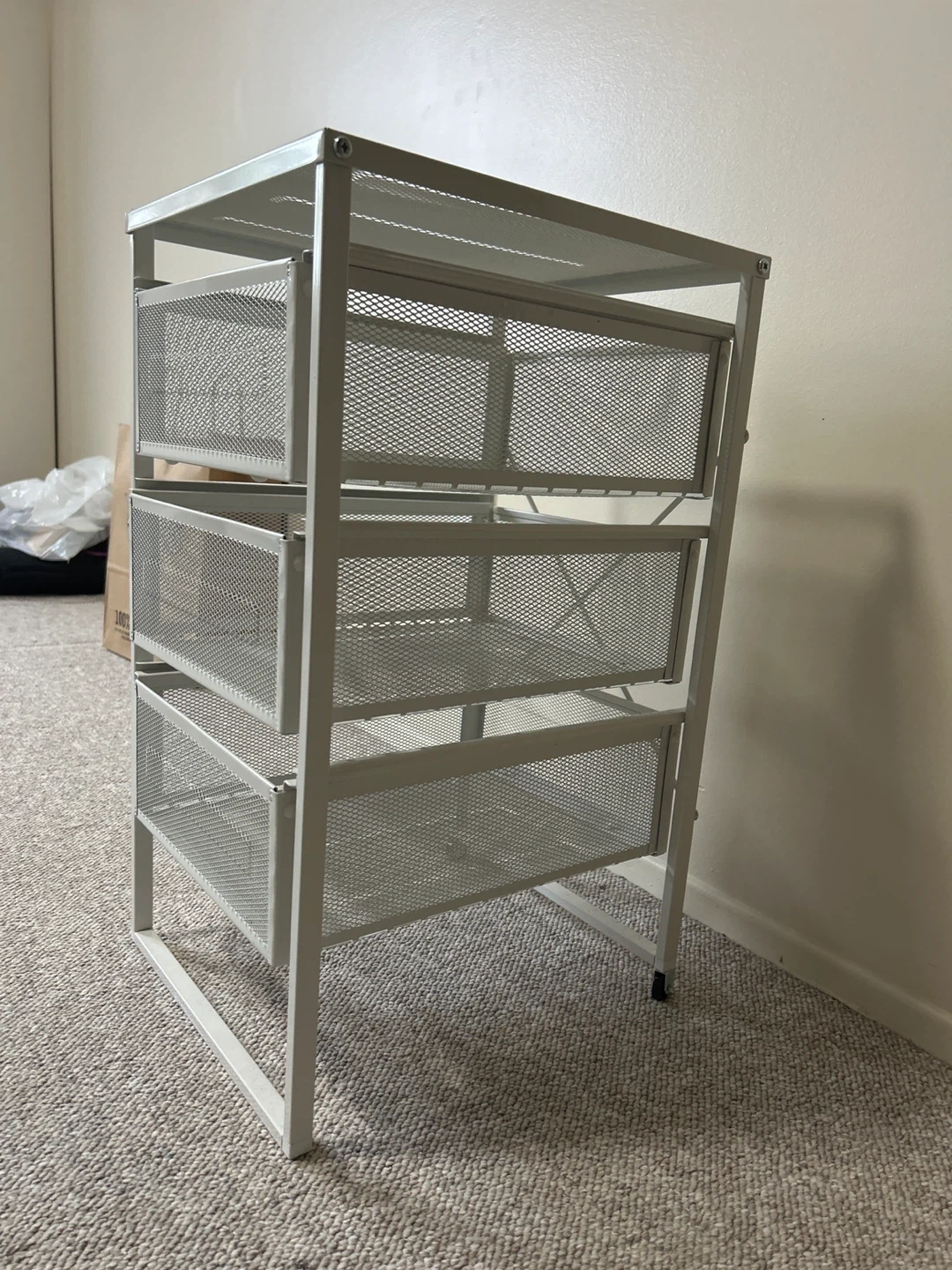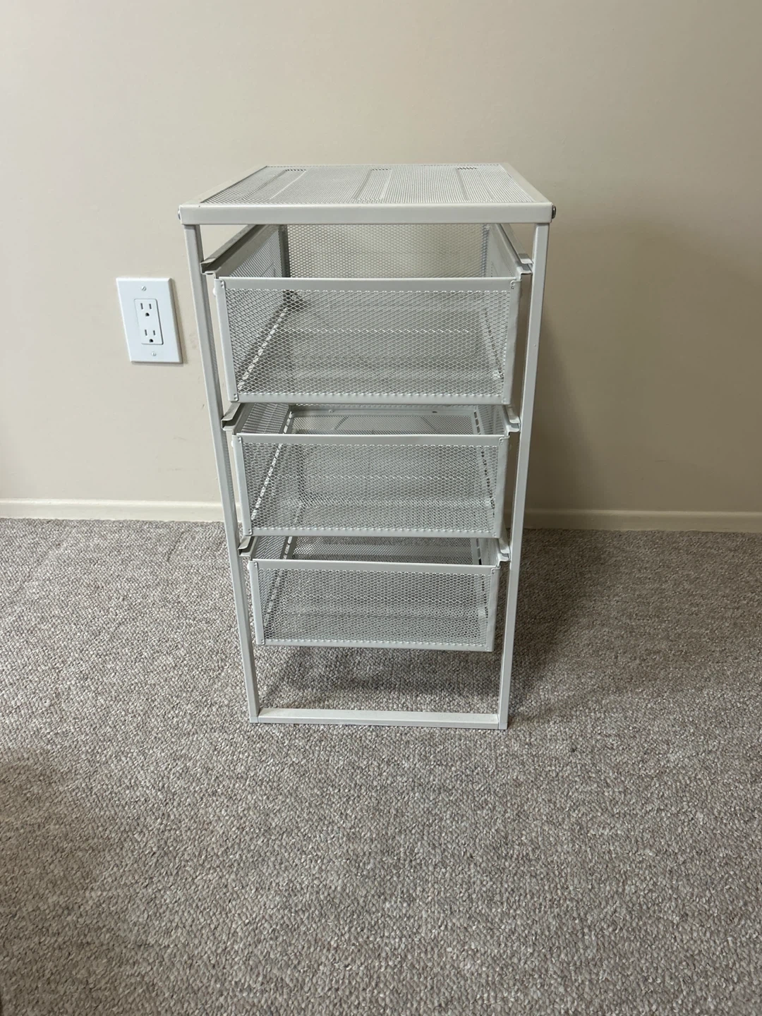 This is a white mesh drawer unit with three baskets. It's great for storing various items. The mesh construction allows for good ventilation.