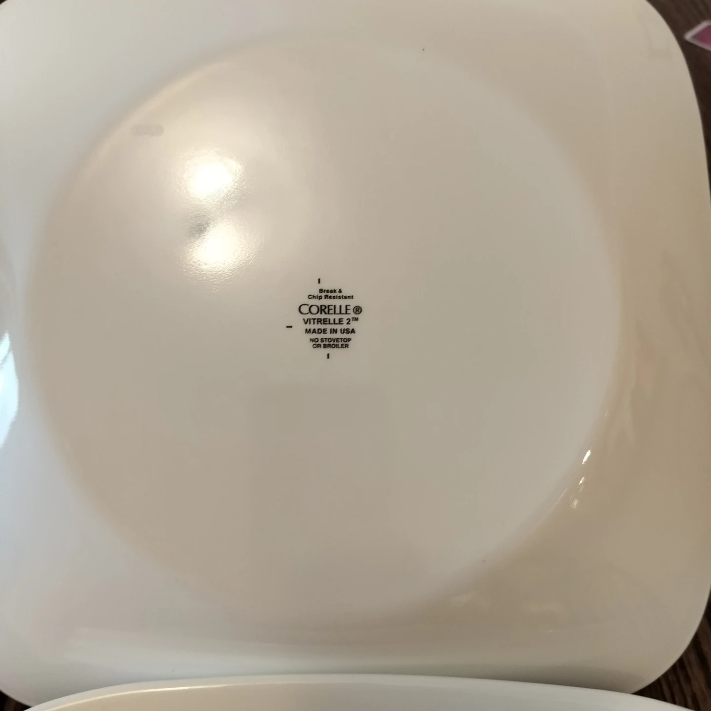 Set of four Corelle square dinner plates. Made with Vitrelle 2 material in the USA. Dishwasher and microwave safe. Suitable for oven use up to broiler.