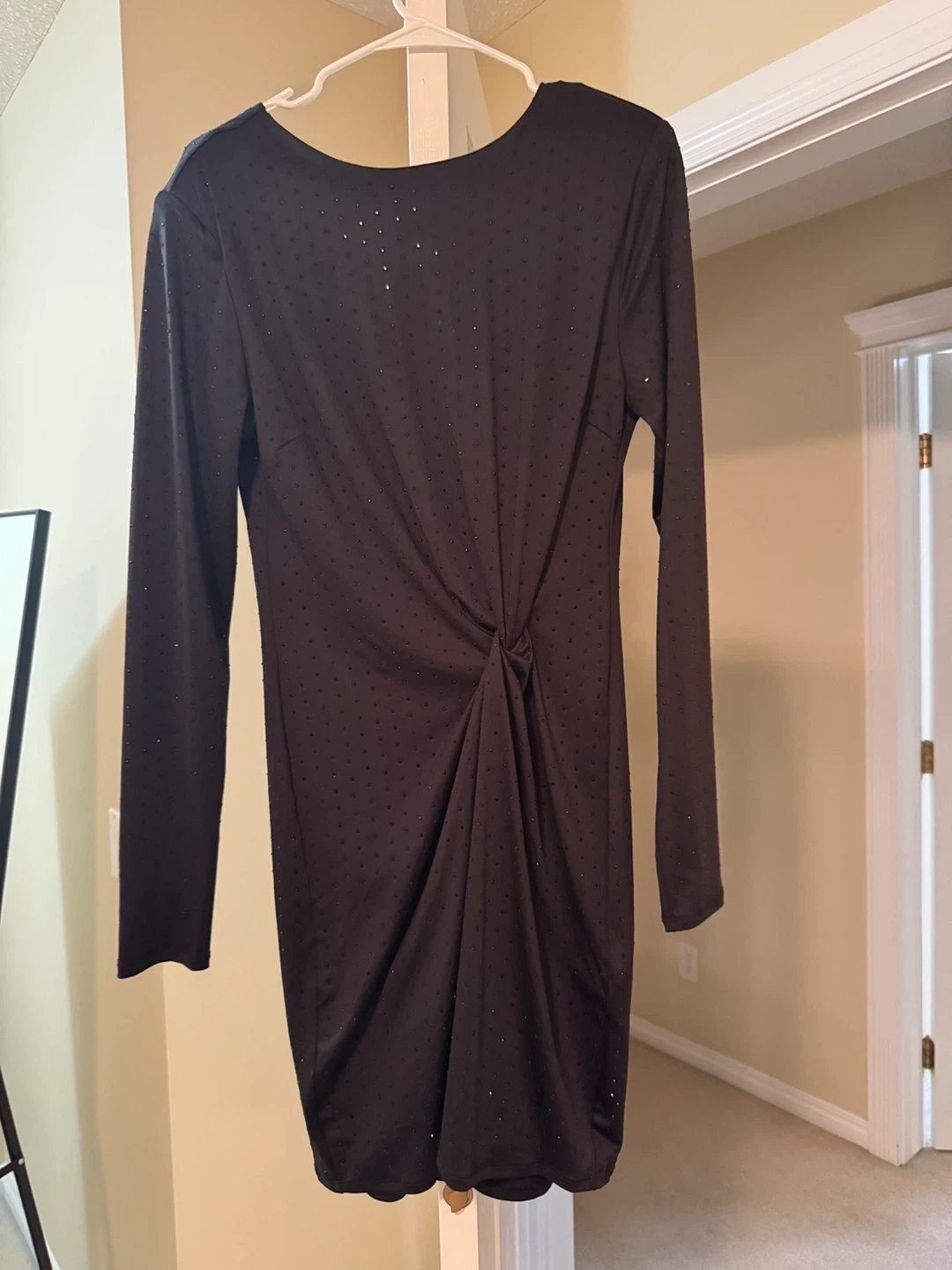Selling a cute black long sleeve dress! It has a stylish twist detail in the front. Perfect for a night out or a special occasion. It's in great condition and ready for a new home!