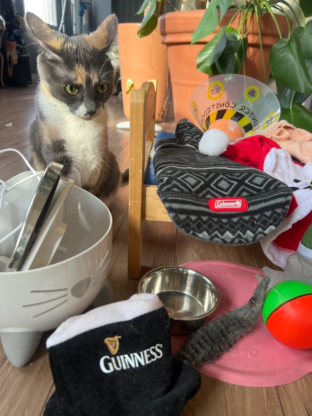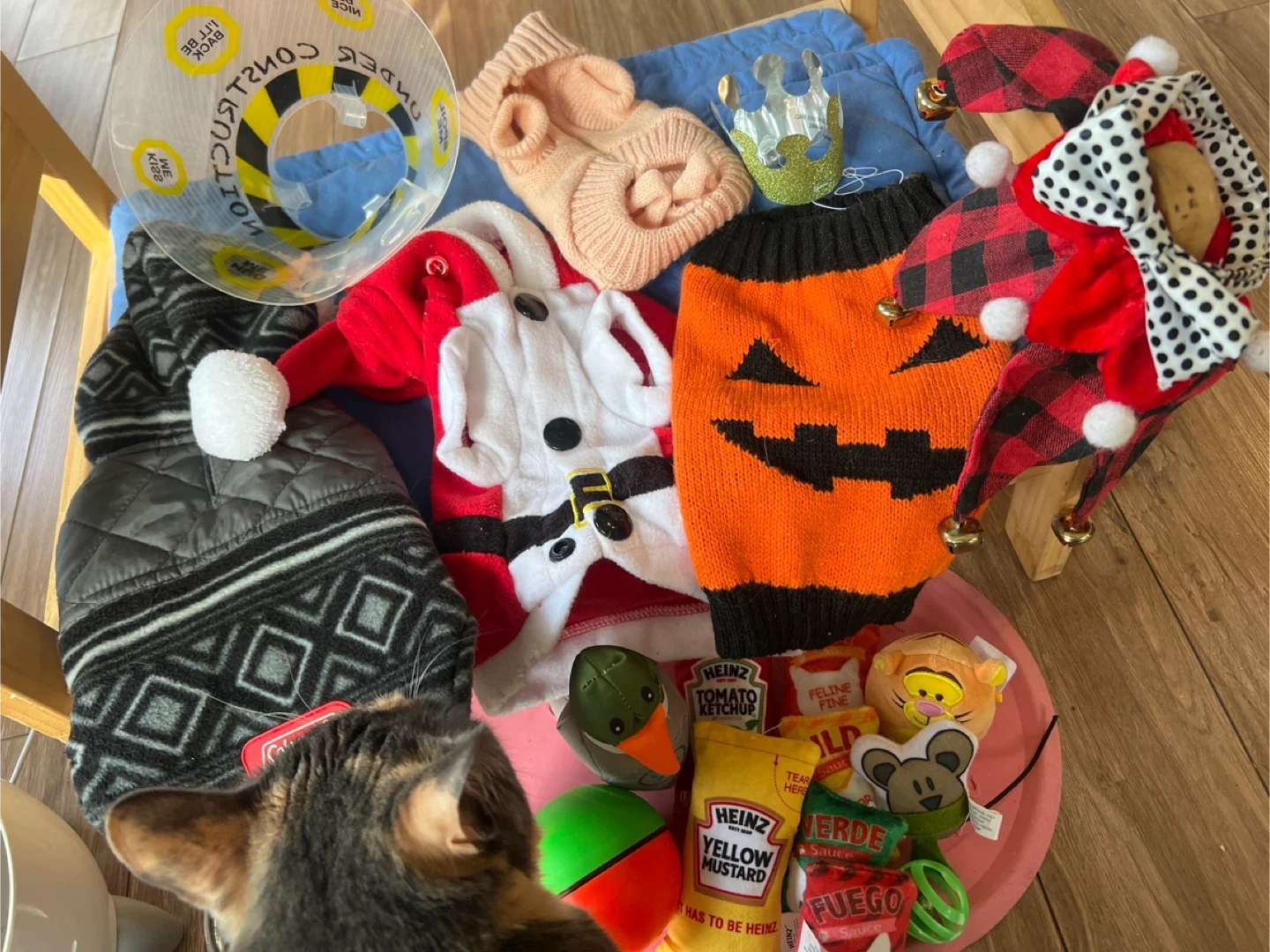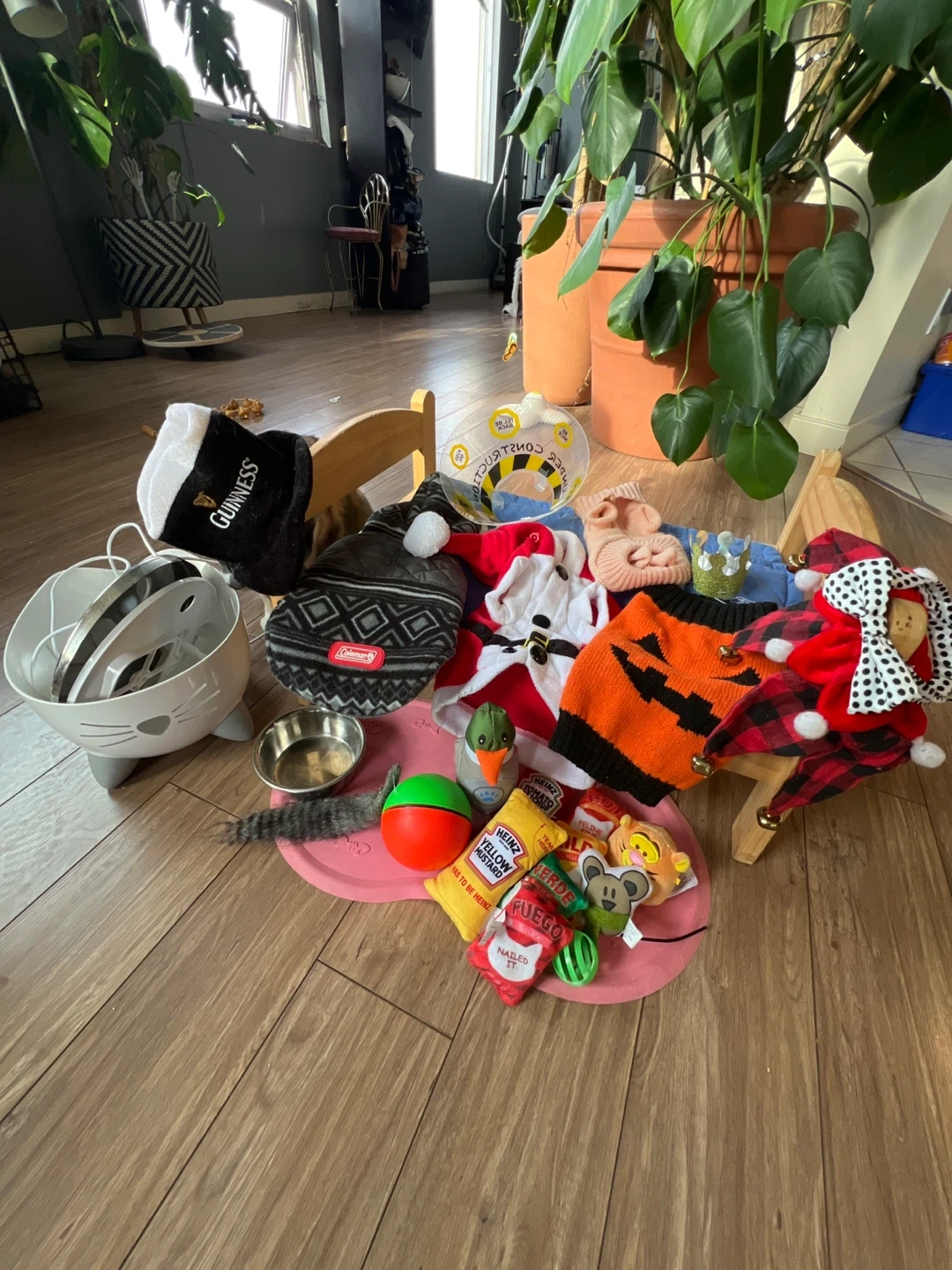 This bundle includes various pet sweaters and accessories. There are also cat toys, a food bowl, and a protective cone. Bedframe, catit water fountain (new motor needed)