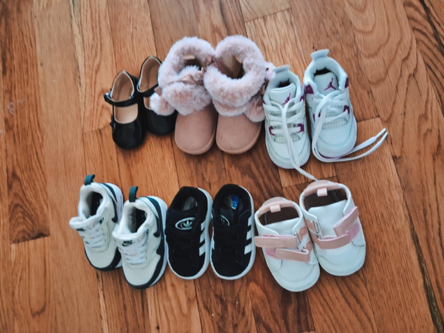A collection of baby shoes including Jordan, Nike, and Adidas. This lot features different styles for little ones. These shoes are perfect for everyday wear or special occasions!