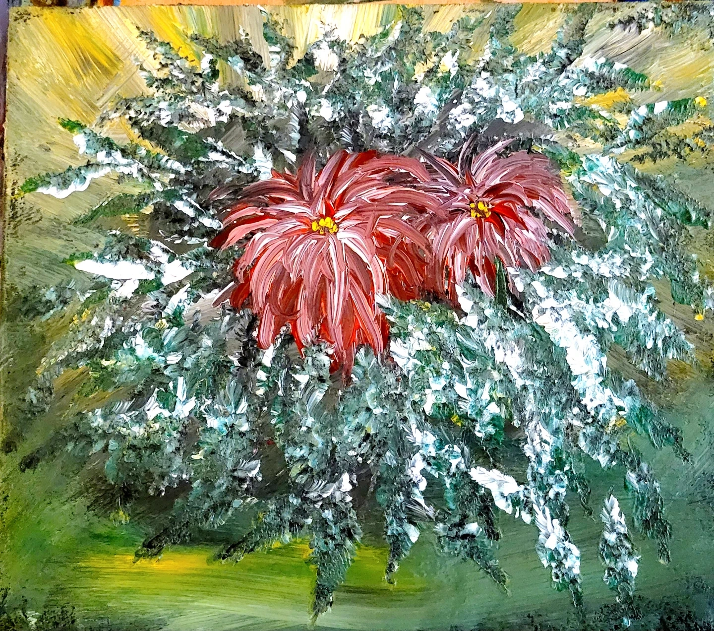 This is an original acrylic painting depicting two vibrant red flowers amongst lush green foliage, with accents of white. It's rendered in a thick impasto style. The artwork is painted on a wood slab and unframed. It's a beautiful piece to add to home's decor or give as a gift.