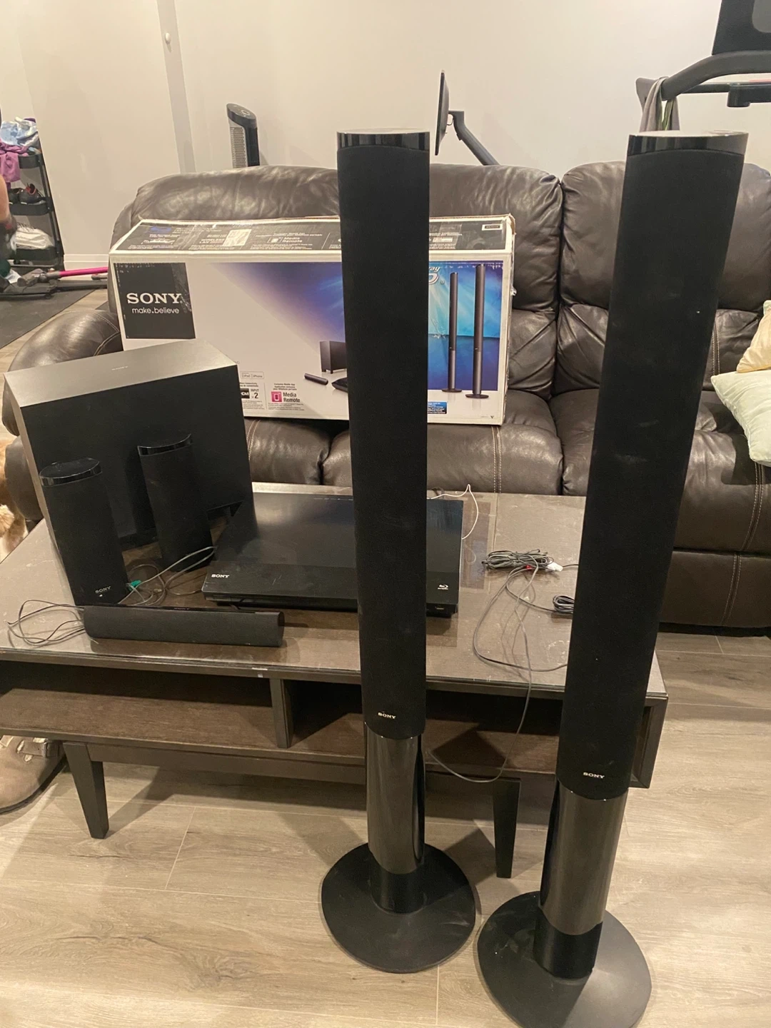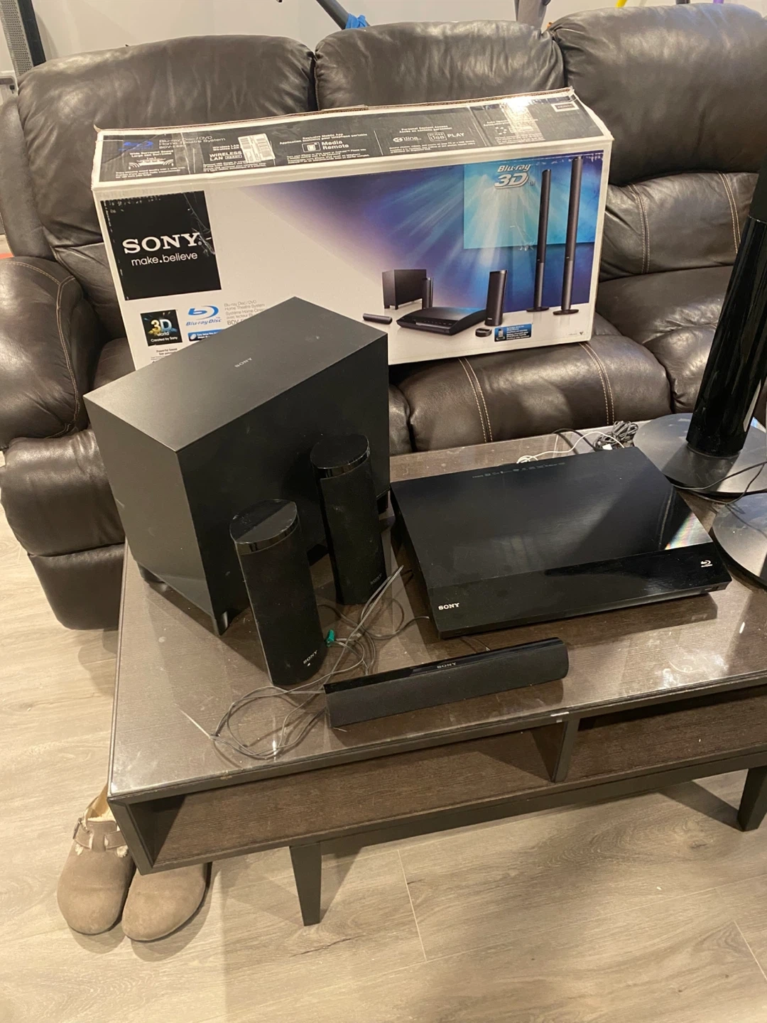 Sony Blu-Ray 3D Home Theatre System. Includes Blu-Ray Disc/DVD player, subwoofer, two tall speakers, two small speakers, and a soundbar. Has 1000W of power. Comes with the original box. Connects via HDMI.