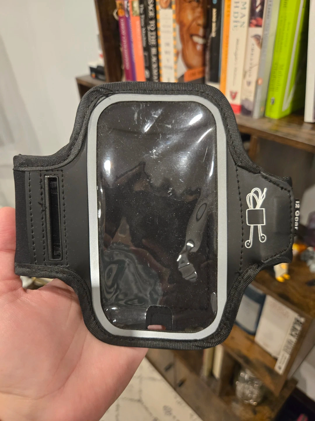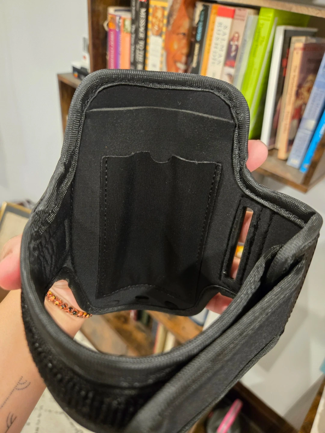 This is a 12 Gear black armband designed for carrying your phone & payment cards while you're active. It's made from neoprene material and features an adjustable strap for a secure fit. It's great for runners or anyone who needs to keep their phone accessible during workouts!