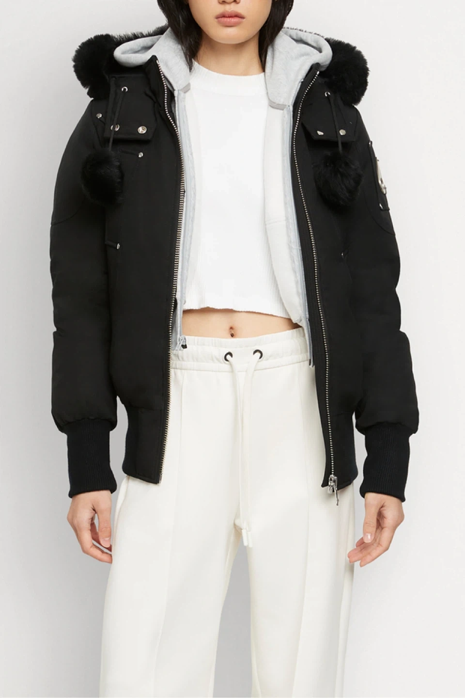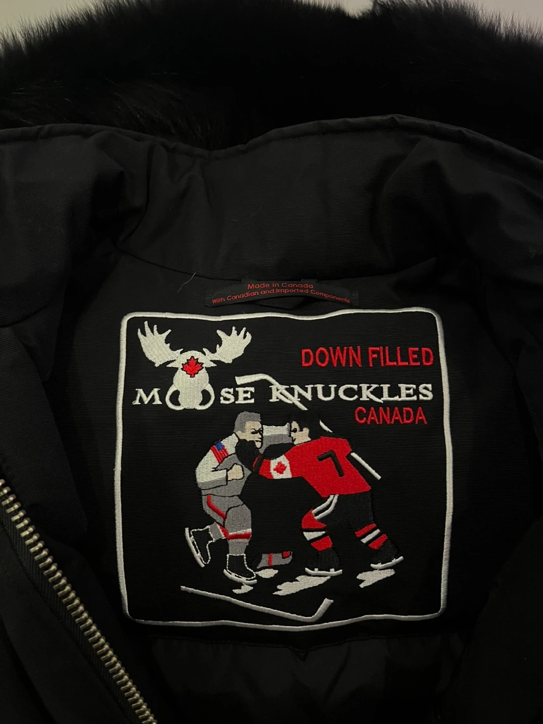 Selling a stylish Moose Knuckles bomber jacket in black. It's in great condition and features a fur-trimmed hood and the iconic Moose Knuckles logo on the sleeve. Perfect for staying warm and fashionable!