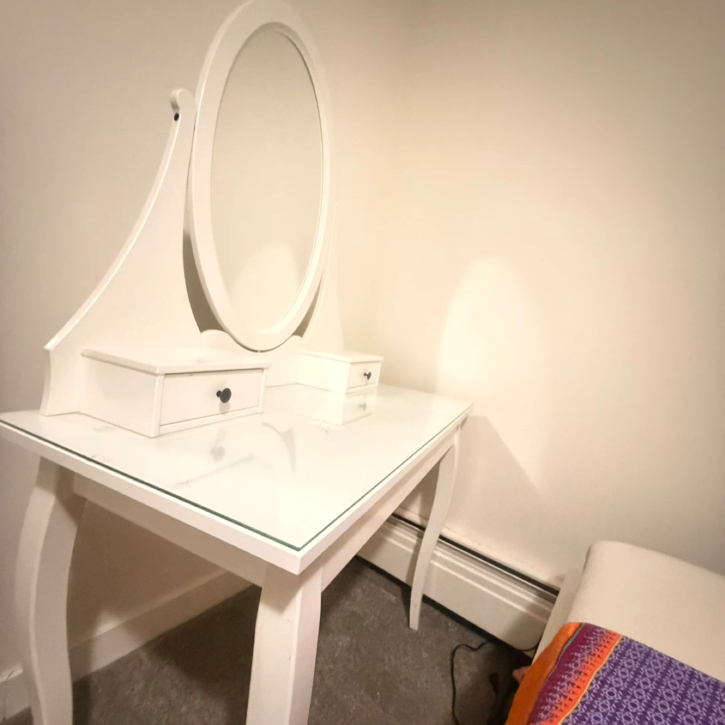 White vanity table featuring an oval mirror and two small drawers for storage. It has a smooth, glossy white finish. The table includes a glass top overlay. Perfect for a bedroom or dressing area!