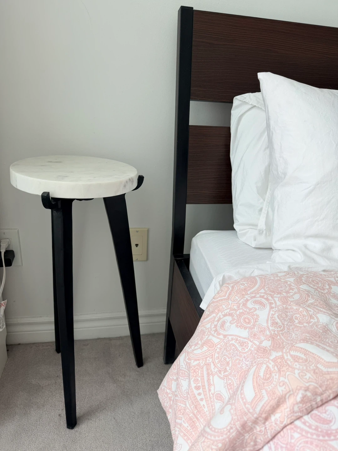 A stylish side table with a real marble top and black metal legs. It's perfect for holding a drink or a book next to a sofa or bed. Its compact size makes it handy for smaller spaces.