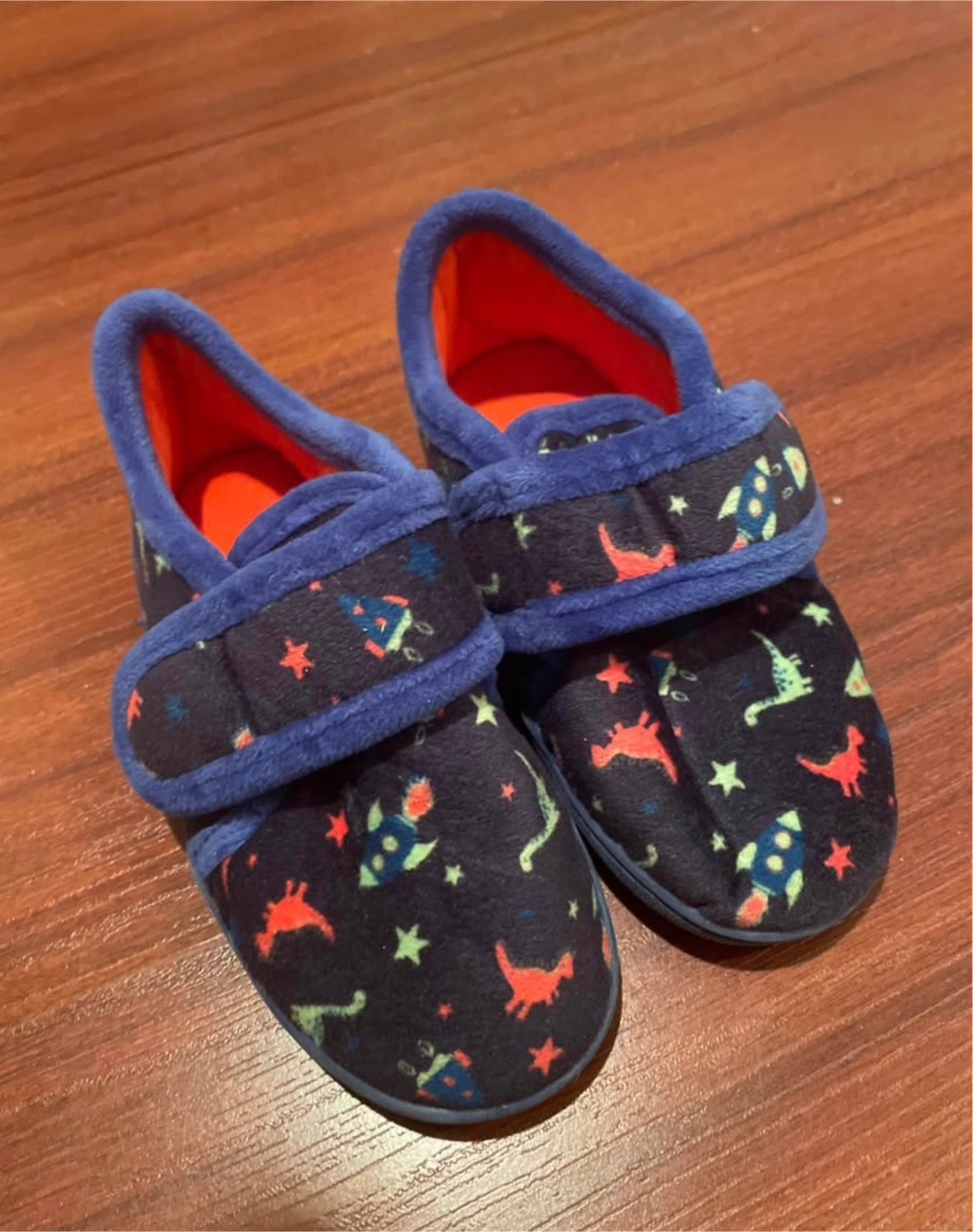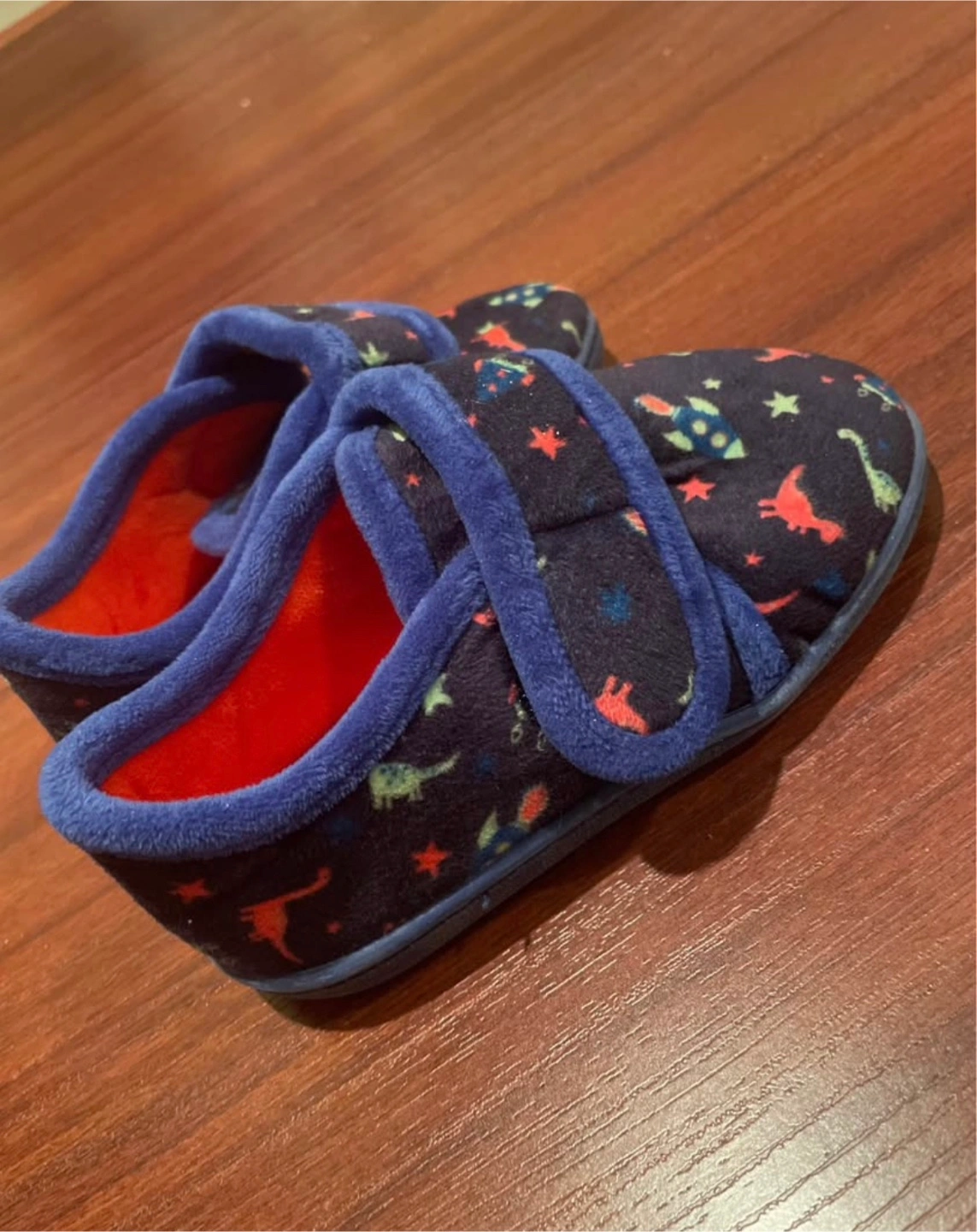 Comfy kids' slippers with a fun dinosaur pattern. Features adjustable velcro straps for a secure fit. Size 9-10.