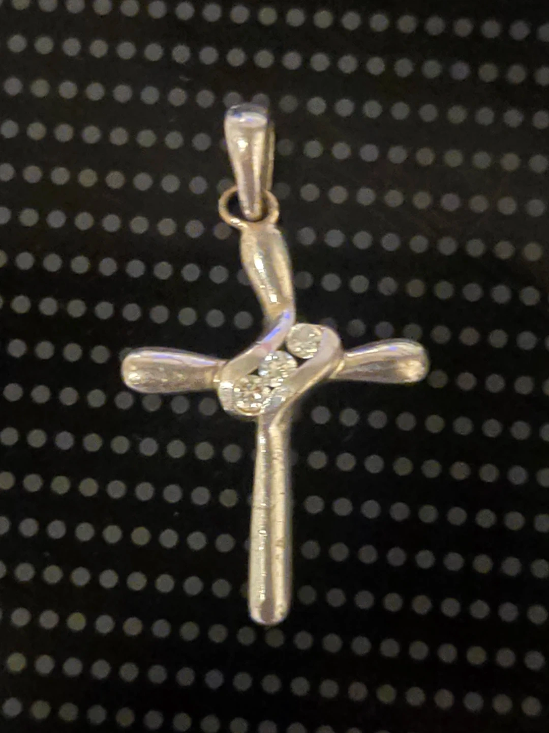 A beautiful cross pendant featuring small diamonds. It's crafted from polished metal and has a unique design. This pendant would make a lovely addition to any jewellery collection.