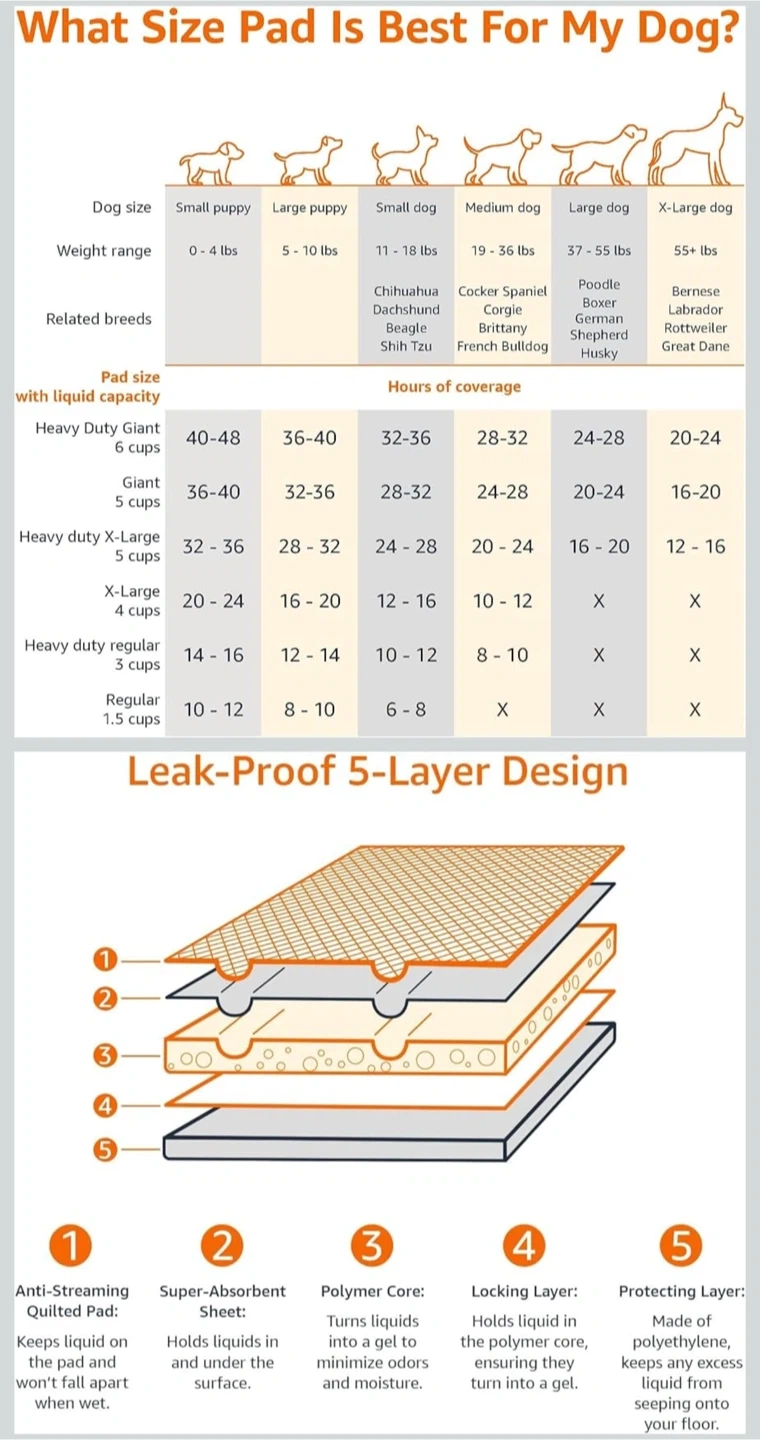These regular size pee pads are 22 x 22 inches and come in a 50 count box. They feature a quick-dry, 5-layer super absorbent design for leak-proof protection. The absorbent core turns liquid into gel on contact for easy cleanup. Built-in attractant aids in potty training.