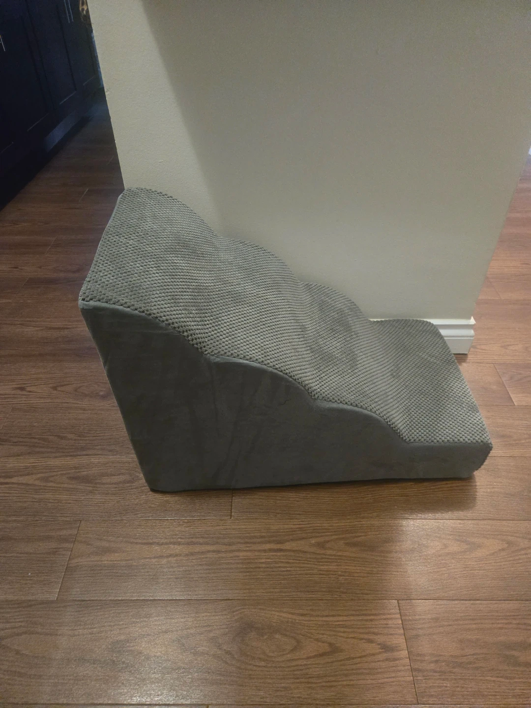 Grey pet stairs providing easy access for smaller pets or older dogs. Foam construction with a textured, grippy top surface. It's about 16 inches tall and 20 inches wide. Used for a month. Perfect condition