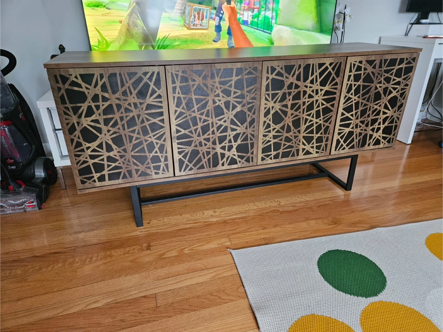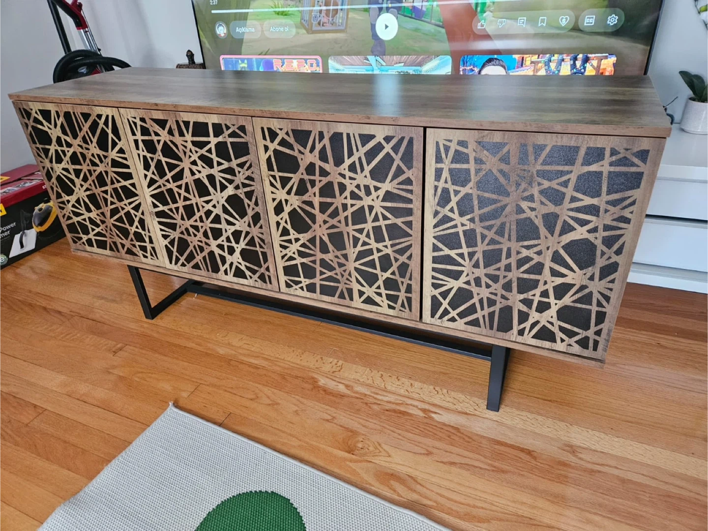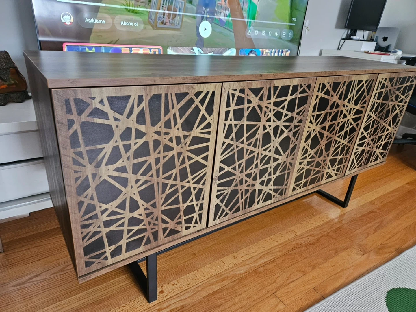 This media console offers a stylish storage solution. It features four doors with a unique geometric design. Inside, there are two shelving units for your electronics or decor.used new home delivery available