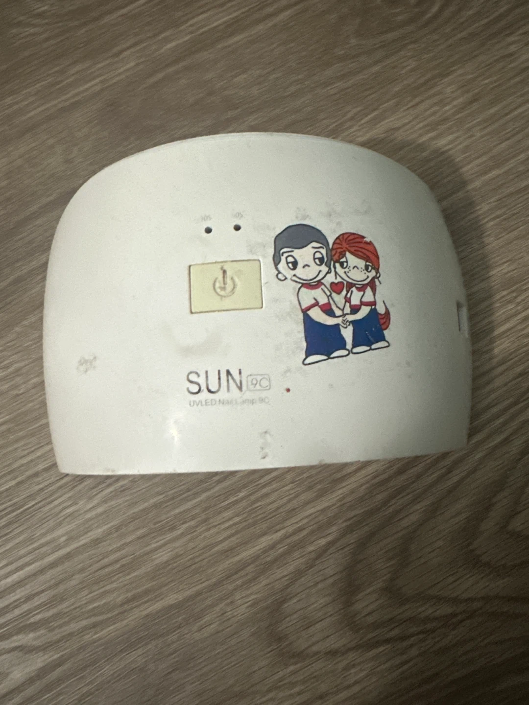 This is a SUN UV LED Nail Lamp 9C for curing gel polish. It has a button for power and timer settings. White plastic casing with cute couple decal.