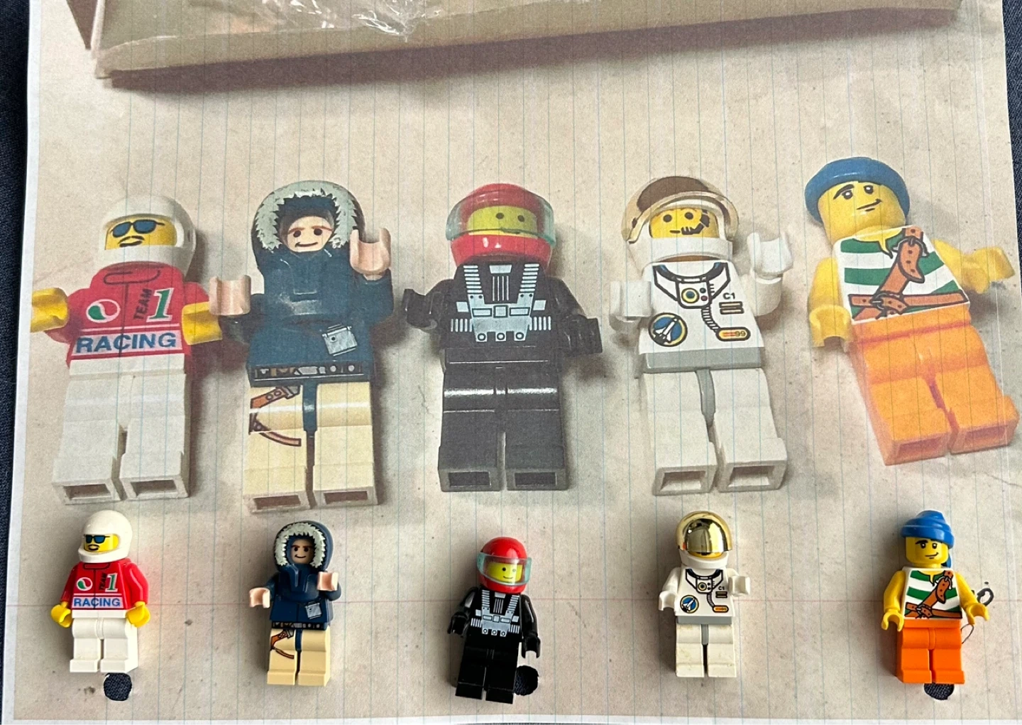 A collection of LEGO minifigures featuring different themes. Includes racers, astronauts, and pirate Star Wars figures. They're made of durable plastic.