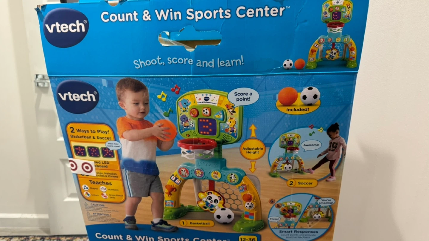 This VTech Count & Win Sports Center offers two ways to play: basketball and soccer. It features an LED scoreboard and adjustable height. The toy teaches shapes, colors, numbers, and gross motor skills. Used just once