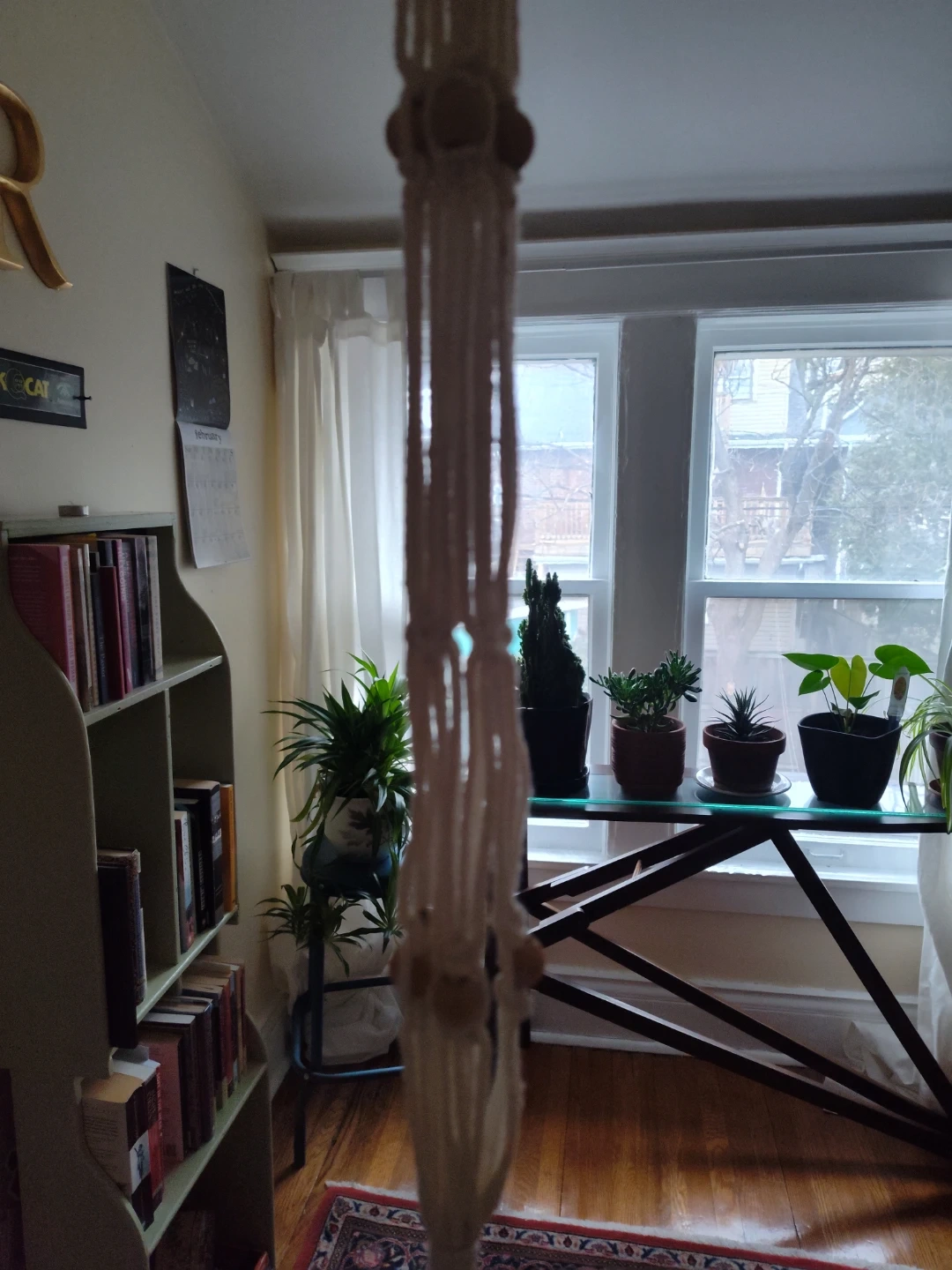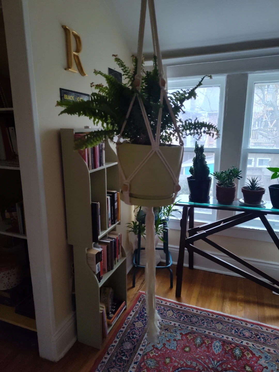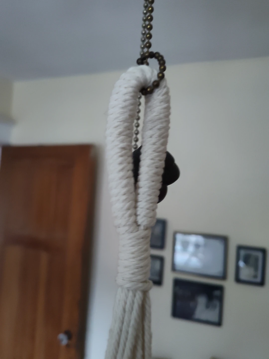 This macrame plant hanger is made from cotton cord and features wooden beads. It's designed to hold pots and add a decorative touch to your space. This hanger is suitable for indoor use and can be hung from a ceiling or hook.