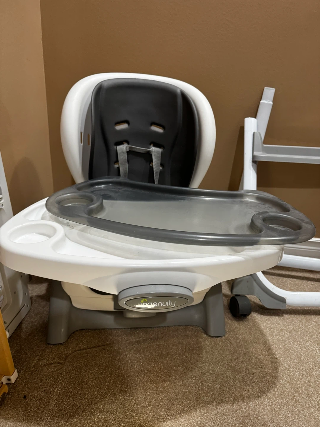 This Ingenuity high chair booster seat is white and grey. It easily converts to a toddler chair. It's suitable for mealtimes and feeding. This chair is great for little ones learning to eat safely.