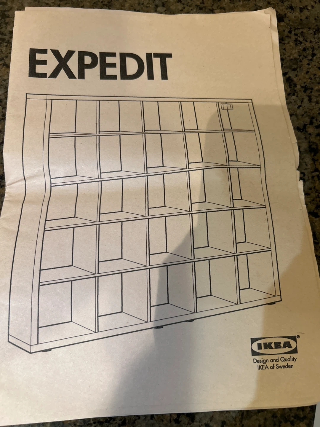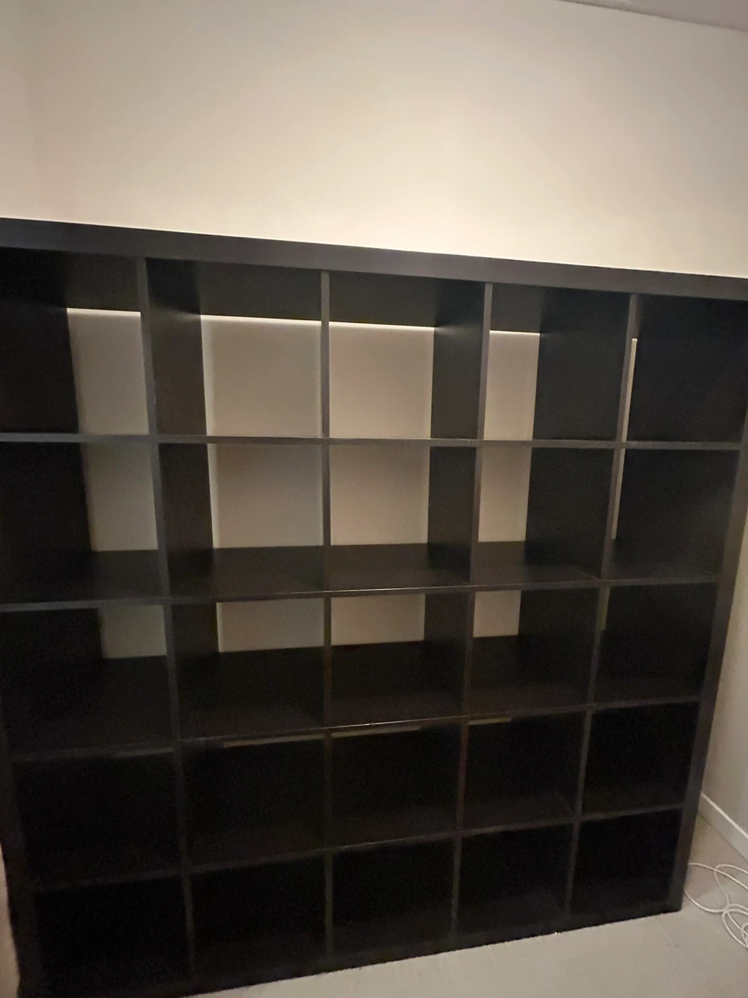 This is an IKEA EXPEDIT shelving unit. It's a large, heavy, modular storage system with 25 cube compartments. This unit provides ample space for books, decor, or any other items you need to organize.