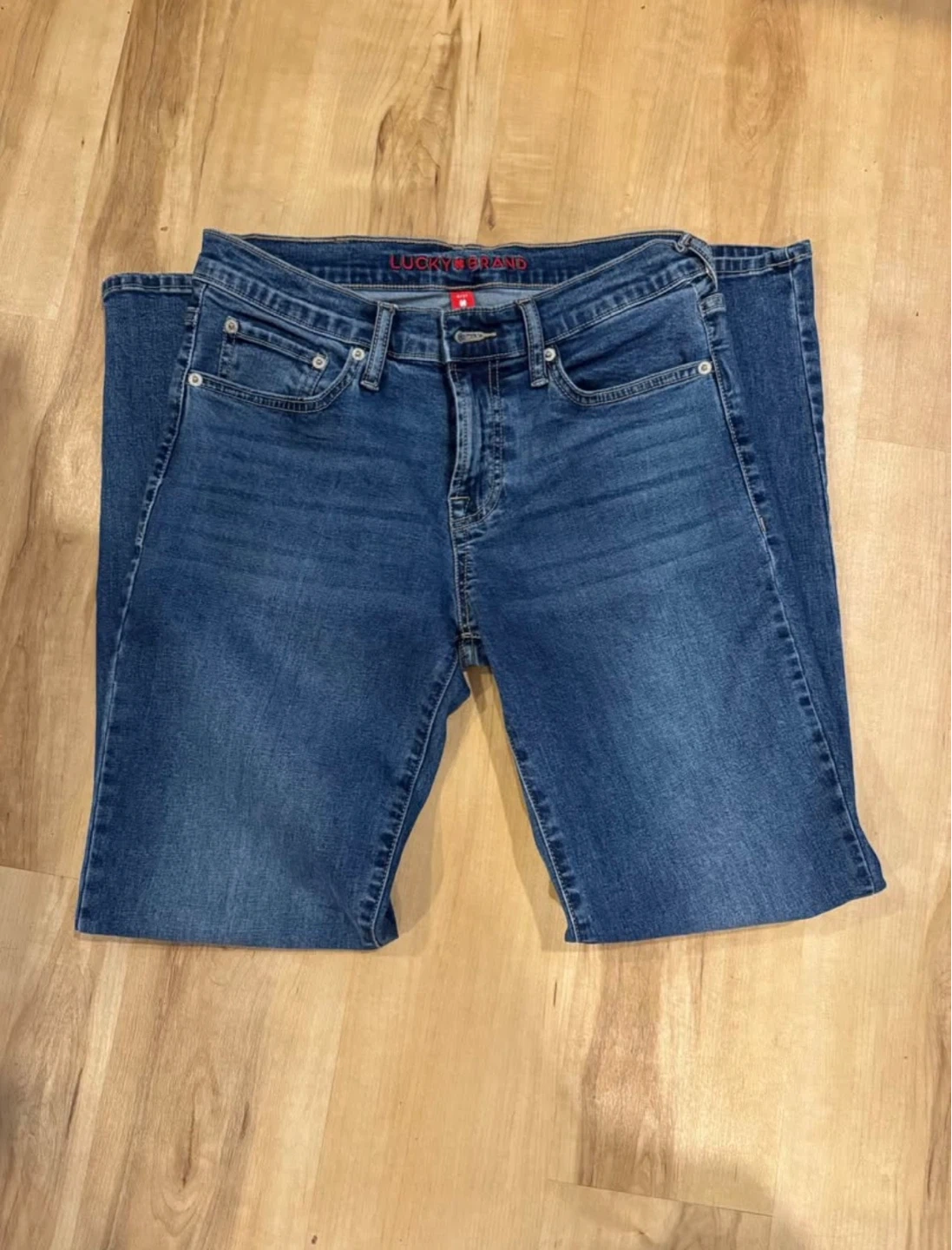 Lucky Brand blue denim jeans. Classic five-pocket styling. Comfortable and durable cotton blend.