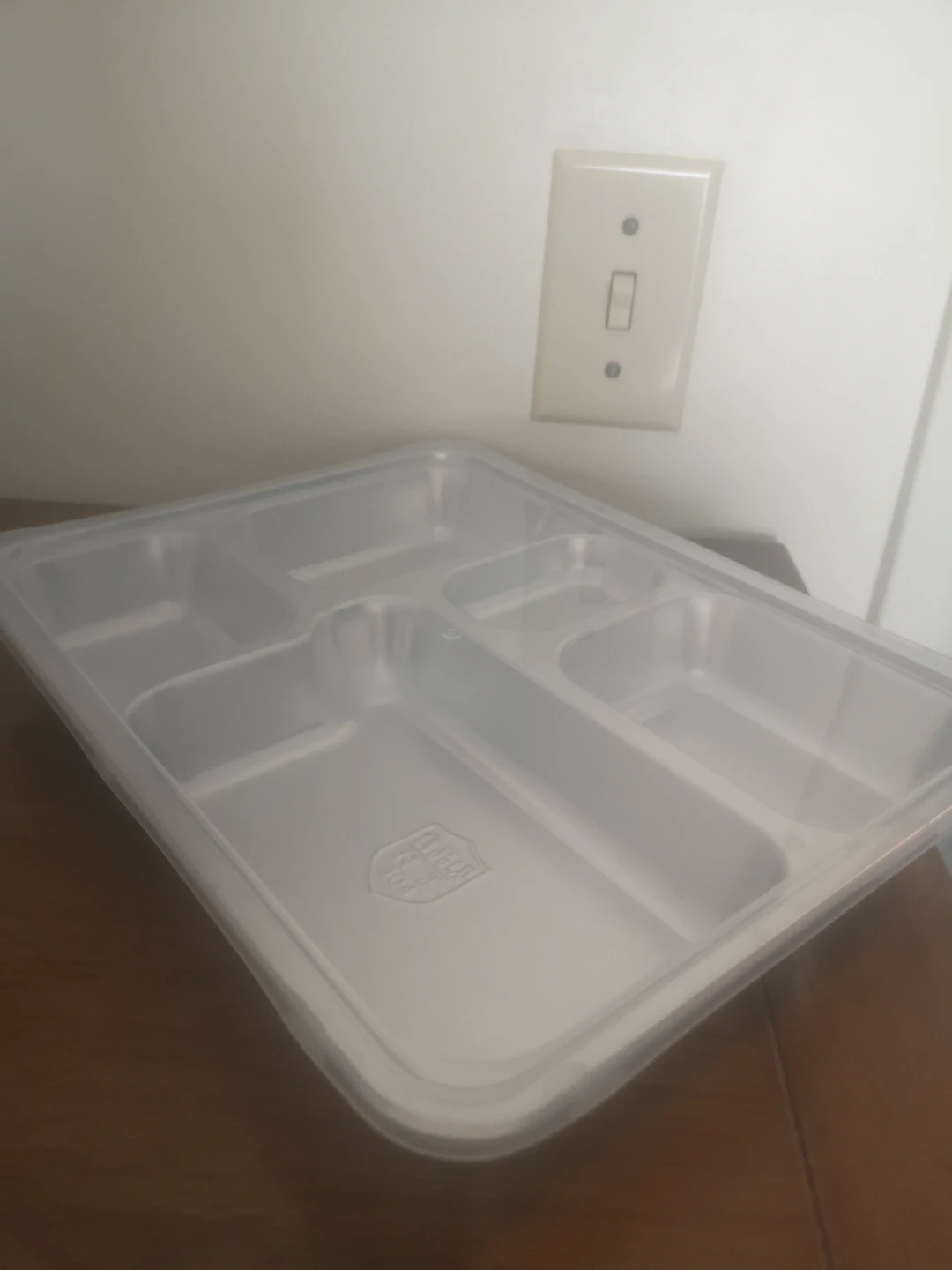 This is a stainless steel lunch tray with five compartments and a clear plastic lid. It's made of 304 stainless steel but it has a crack on the rim (came that way). Might be useful for organizing a drawer or sorting change or other small items. Could still be used for food, but care must be taken when washing it, or use a dishwasher.