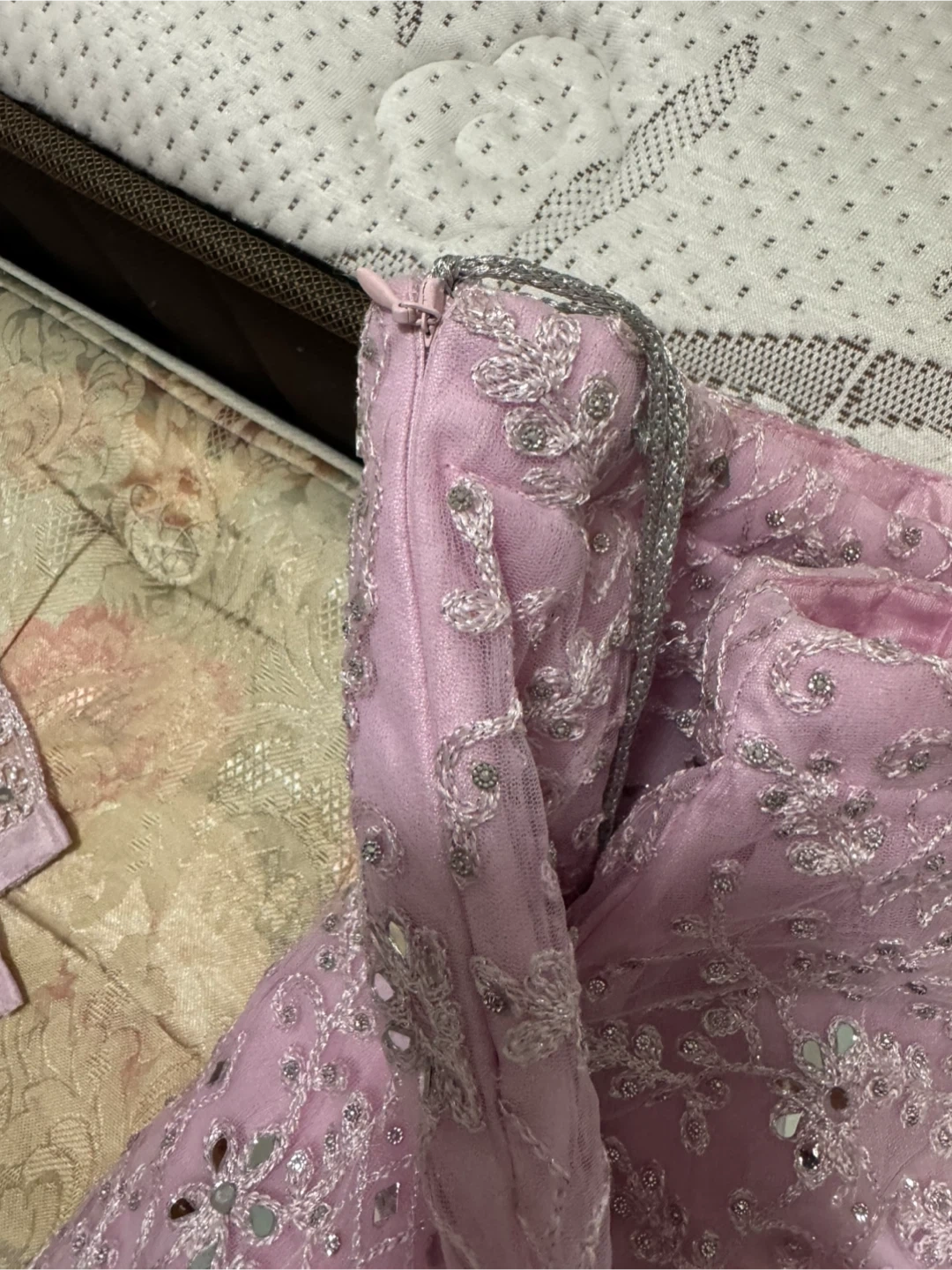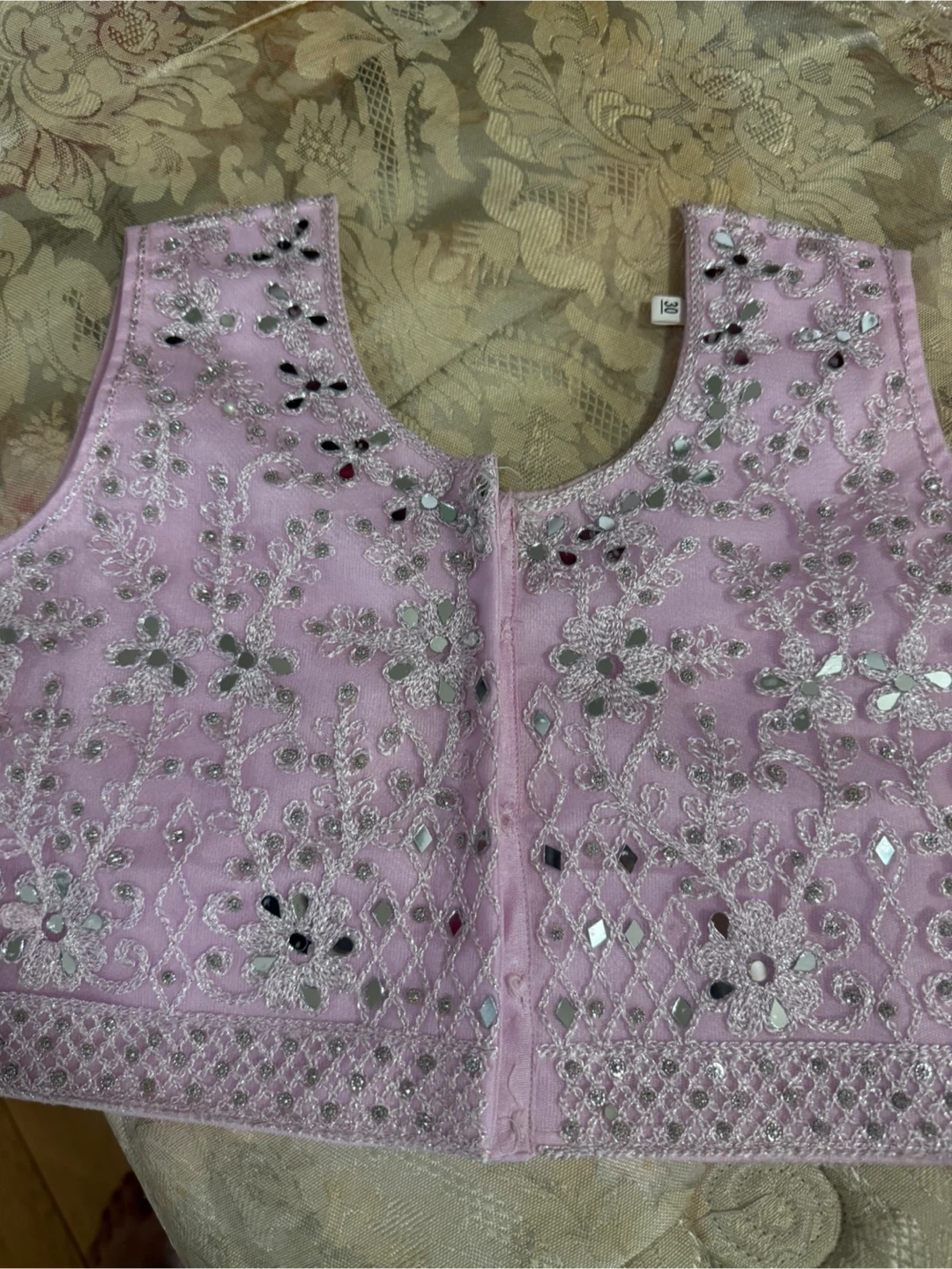 This is a beautiful pink lehenga choli set with intricate embroidery and mirror work. It comes with a matching dupatta. Perfect for special occasions and festive events!
