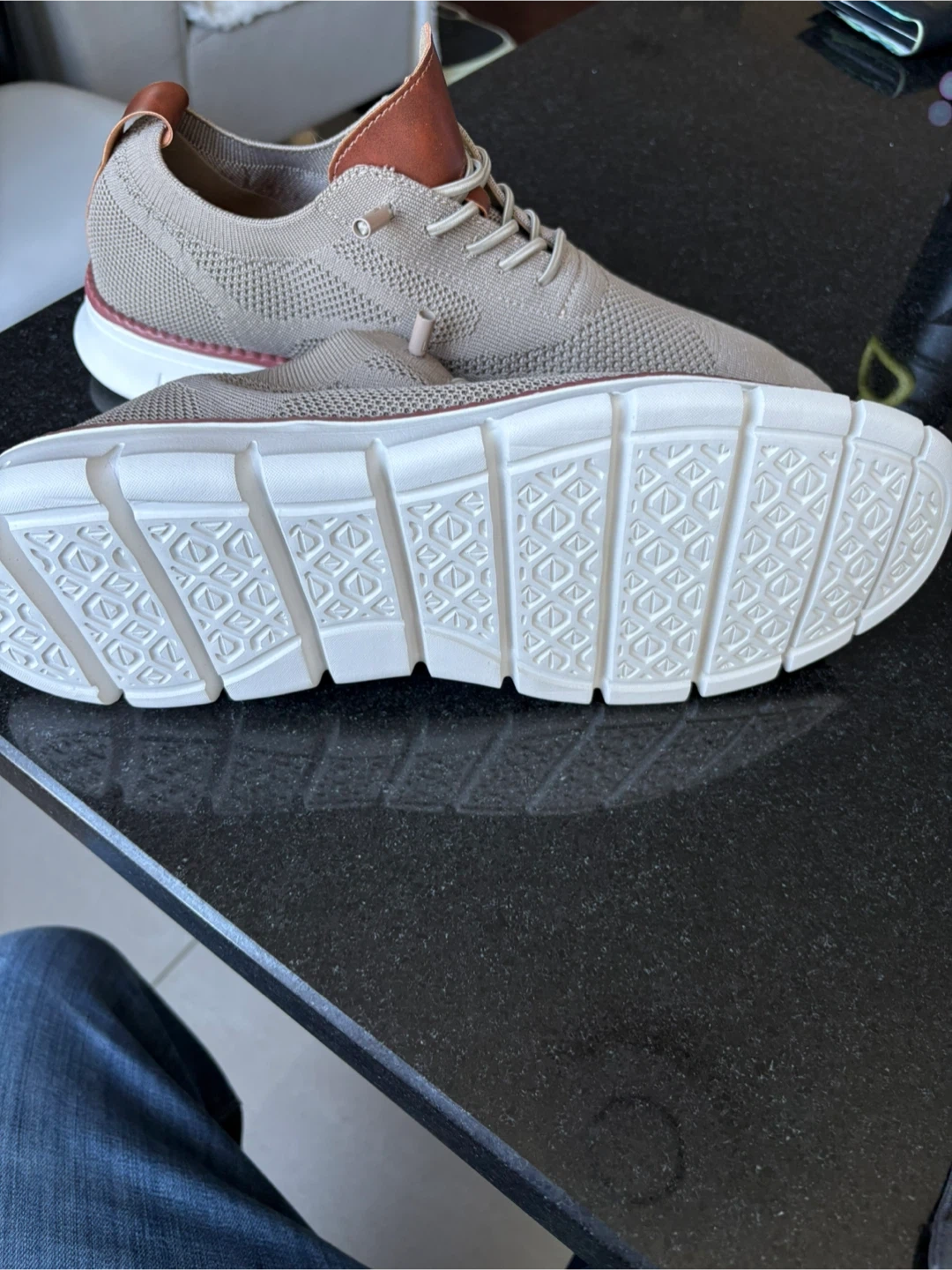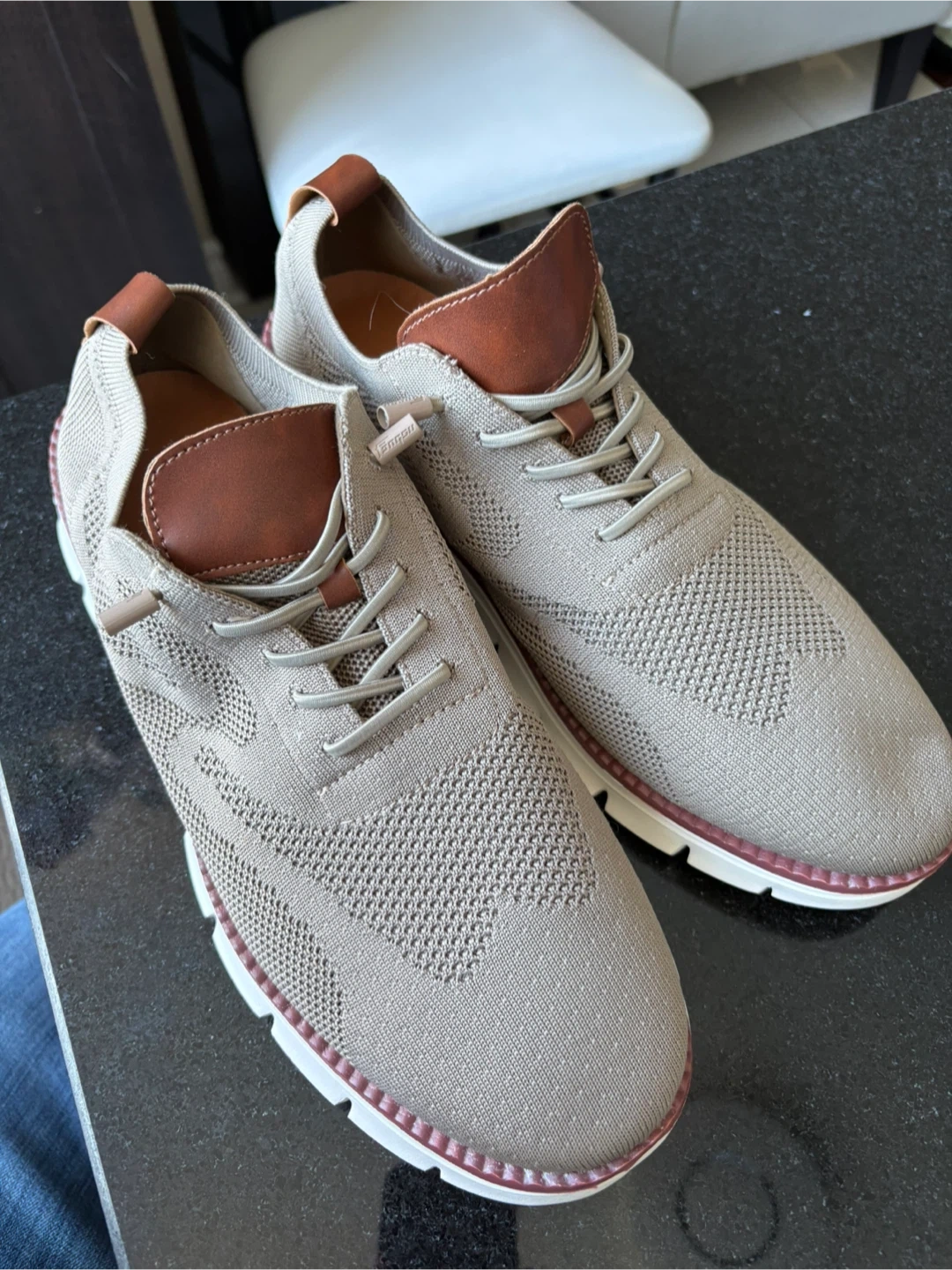 Stylish tan knit sneakers featuring brown leather detailing on the heel and tongue. These shoes have a modern silhouette with a comfortable cushioned sole. The breathable knit upper makes them great for everyday wear. They also have a larger toe box for diabetic feet.
