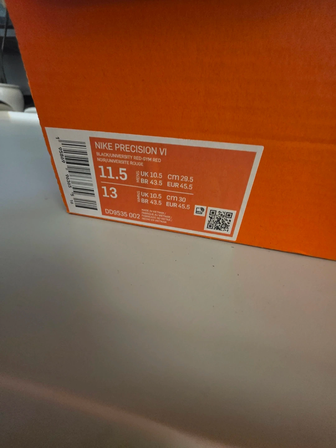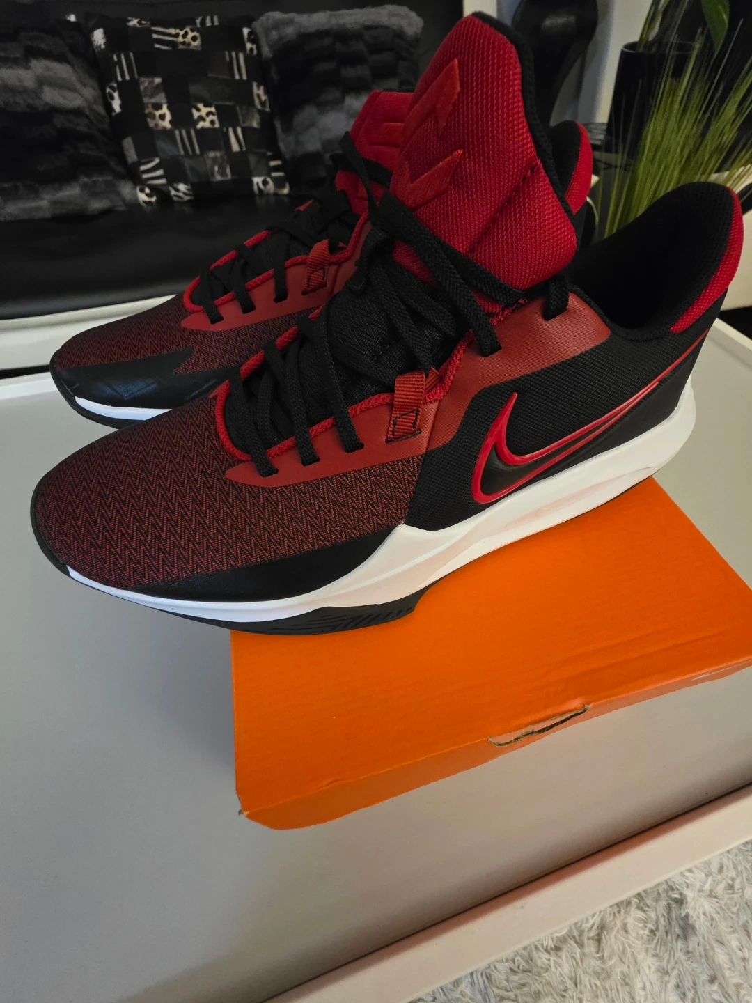 Nike Precision VI basketball shoes in black and university red. Men's size 11.5 US. These shoes offer good support for the court. They're made for performance and comfort!