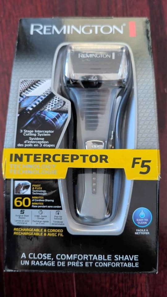 Interceptor Shaving Technology with Pivot and Flex Technology. Integrated intercept trimmer cuts up to three days worth of growth. Pivot and Flex foils follow the contours of your face and neck for a close, comfortable shave. Rinseable design, popup trimmer. Can be used corded or cordless with a 60-minute runtime. Features a 5-minute quick charge, LED fuel gauge, and auto worldwide voltage.