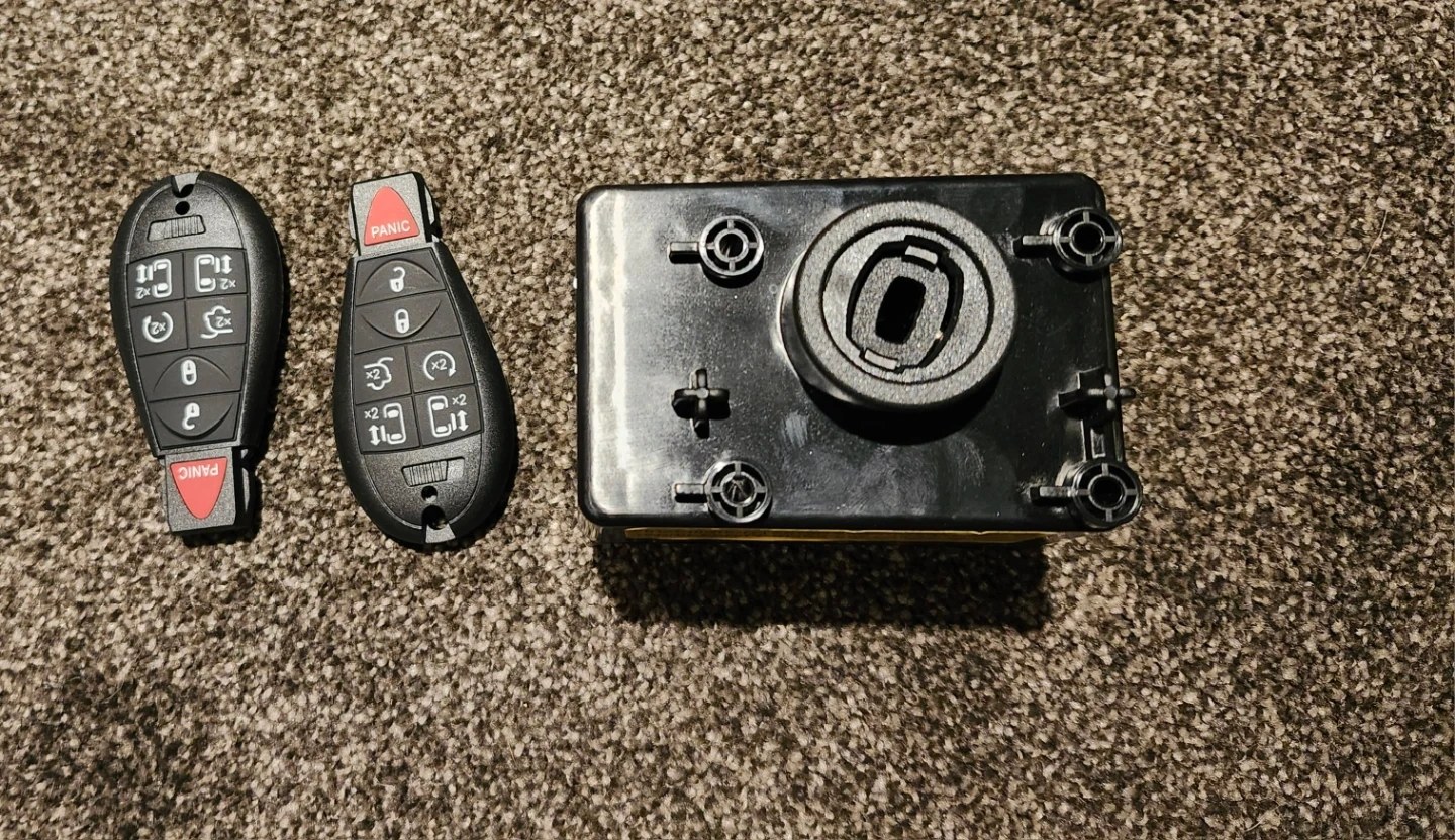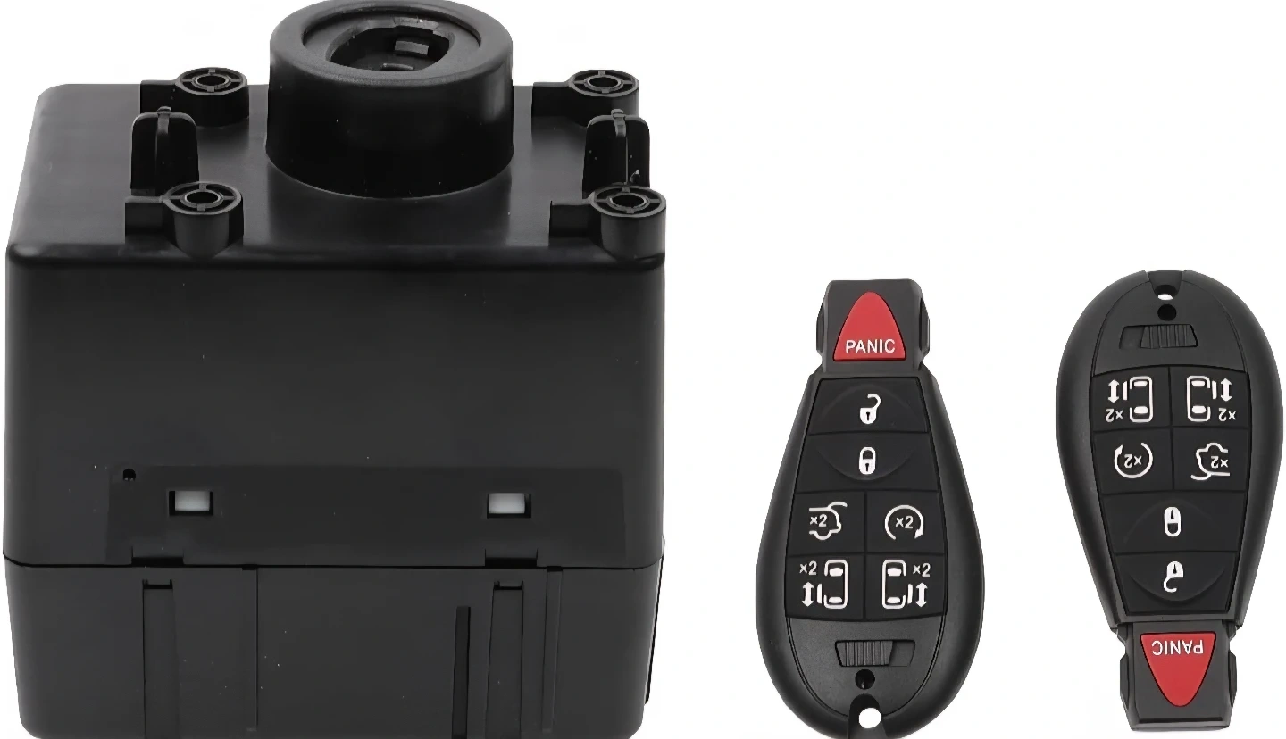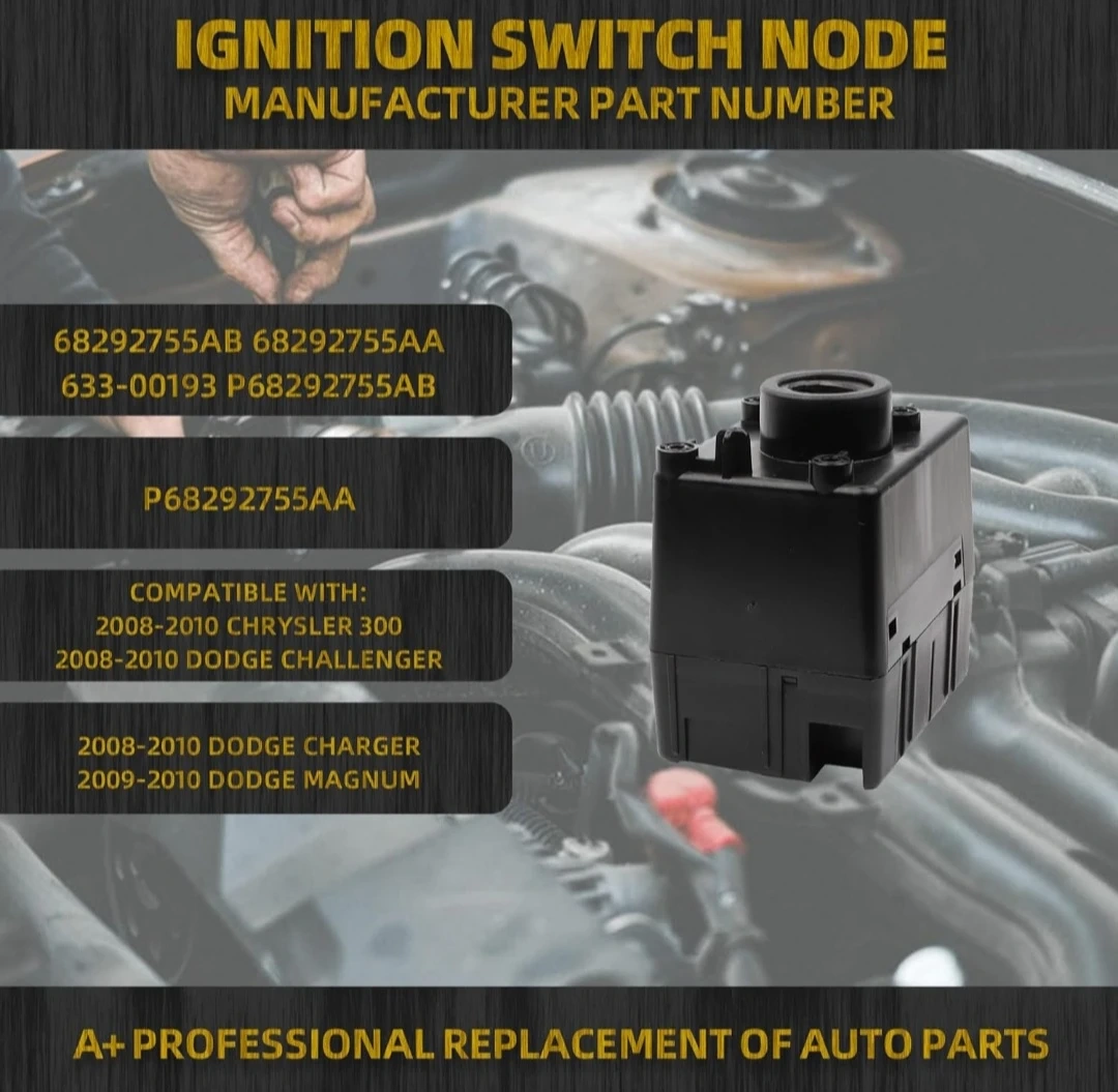 Ignition switch node and two key fobs. Compatible with 2008-2010 Chrysler 300, 2008-2010 Dodge Challenger, 2008-2010 Dodge Charger, and 2009-2010 Dodge Magnum. Part numbers include 68292755AB and P68292755AA.