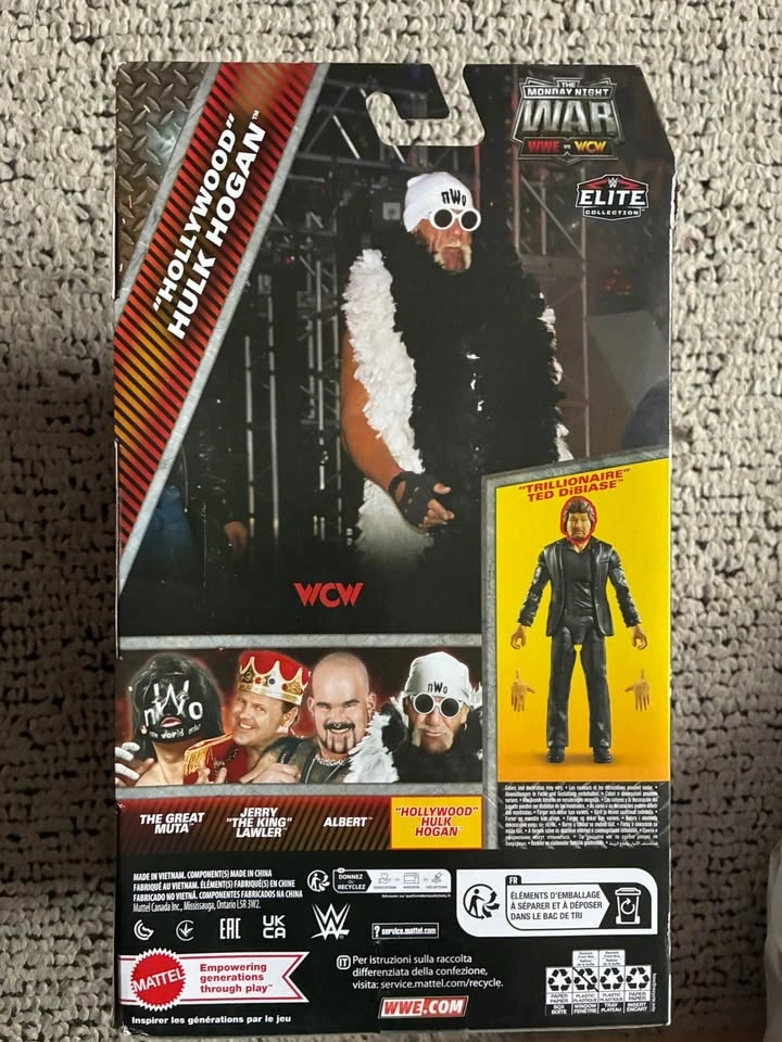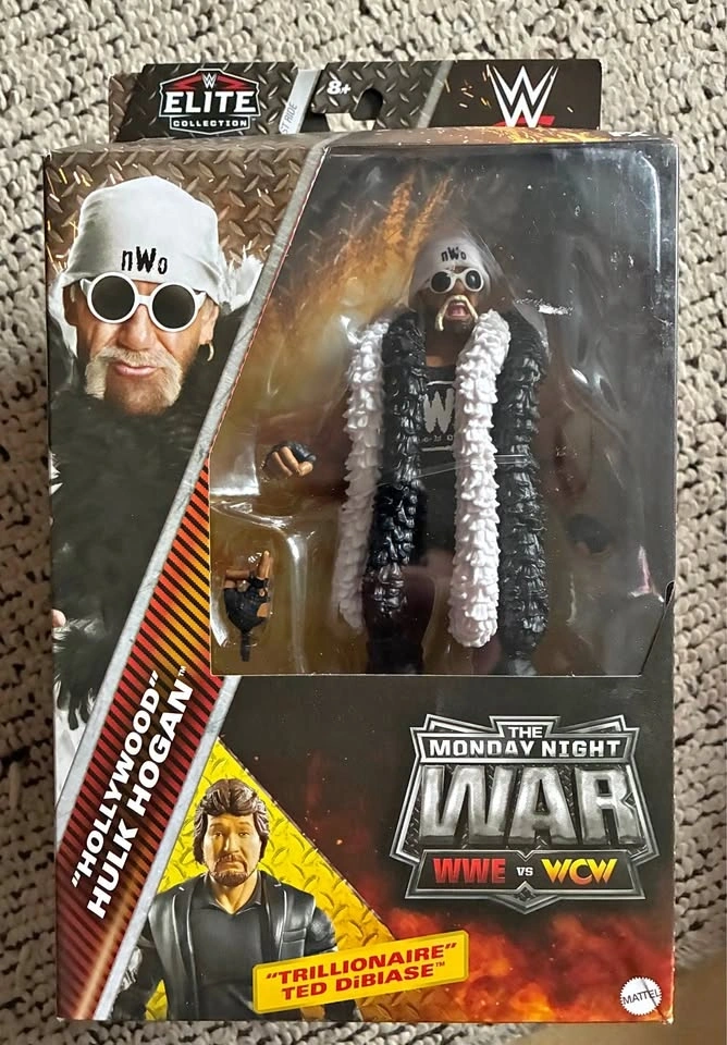 Selling a Mattel WWE Elite Collection action figure of "Hollywood" Hulk Hogan from the Monday Night Wars series. It comes with his nWo vest, boa, sunglasses, cap, and interchangeable hands. Also includes a part to build a "Trillionaire" Ted DiBiase figure. Let me know if you're interested!