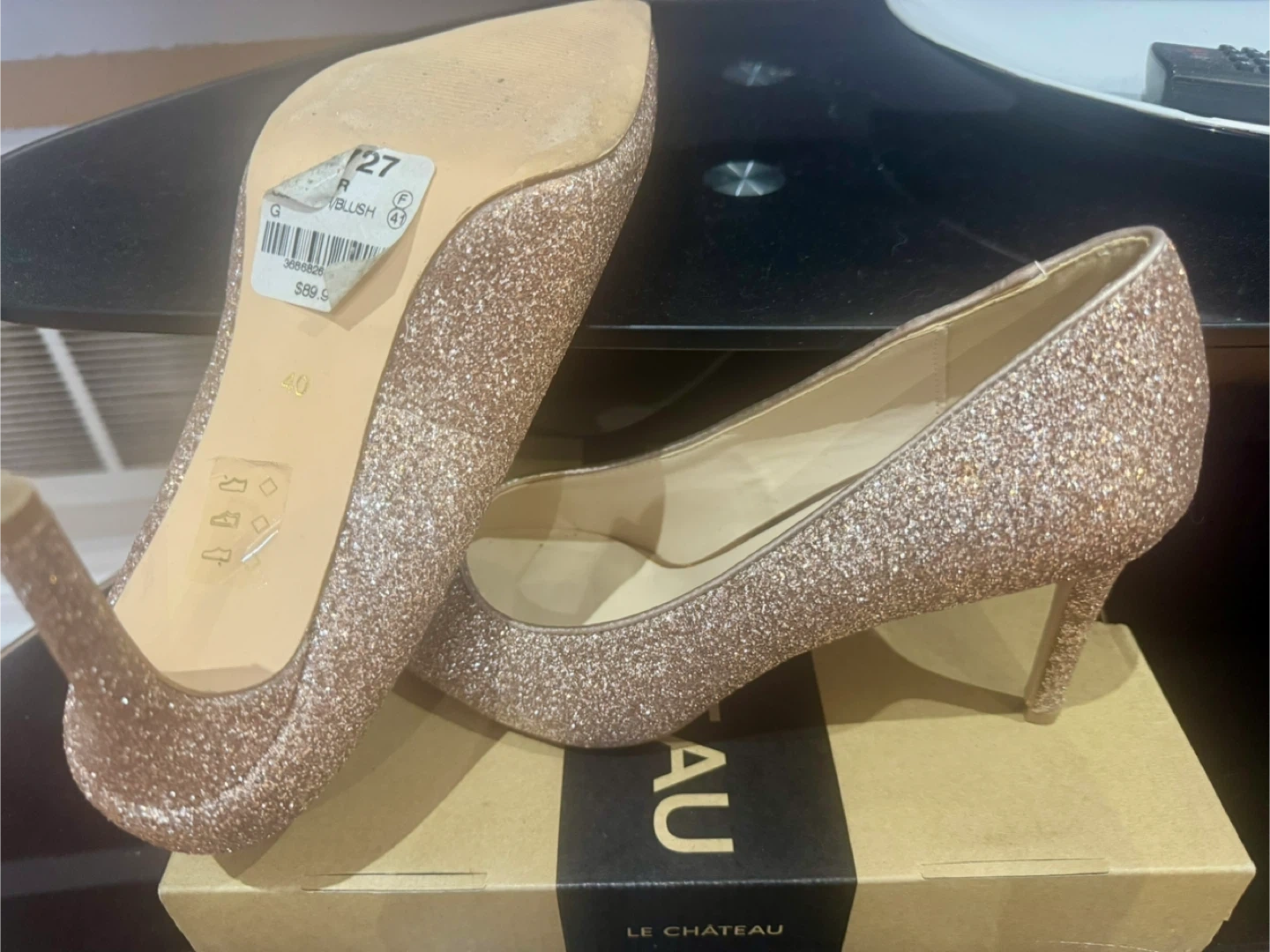 Sparkly rose gold glitter heels from Le Château. These elegant pumps feature a pointed toe and a stiletto heel. Size 40.
