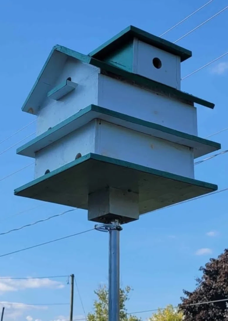 A charming three-tiered birdhouse with a green roof and white body. Multiple openings for Purple Martins π