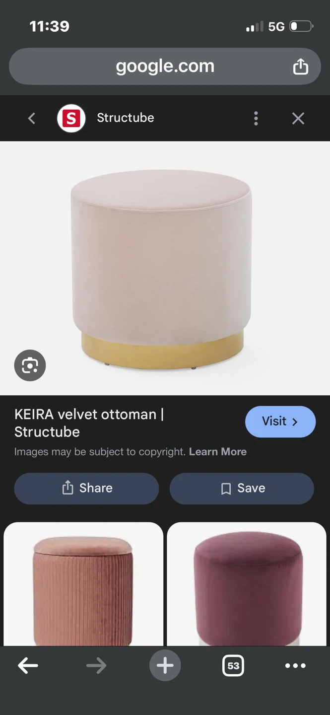 Structube Keira velvet ottoman in a soft pink colour. It features a gold-toned base. This ottoman adds a touch of style to any room.