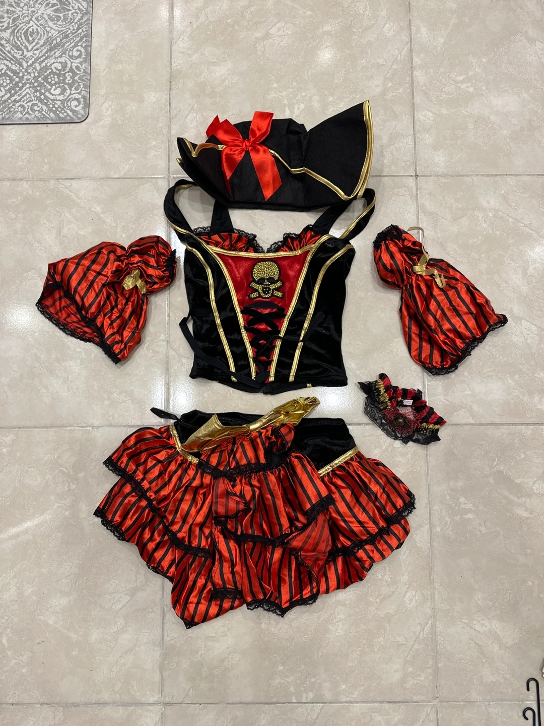 Ahoy there! I'm selling a Dreamgirl Wild at Sea pirate costume. It includes the pirate hat, velvet and satin corset with beaded skull patch, satin ruffled skirt, and a pair of satin sleeves. Size is XS and intended for adult use only (Age 14+).
