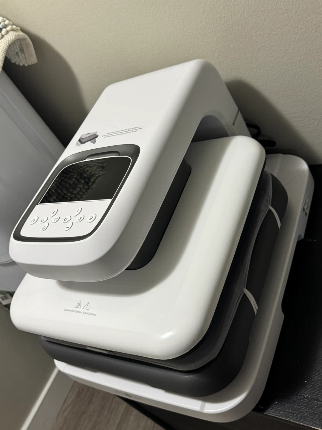 This is a white HTVRONT heat press machine. It has a digital display and control buttons for temperature and time. The machine includes multiple heat plates for various applications. It's suitable for T-shirts, mugs, and other crafts.