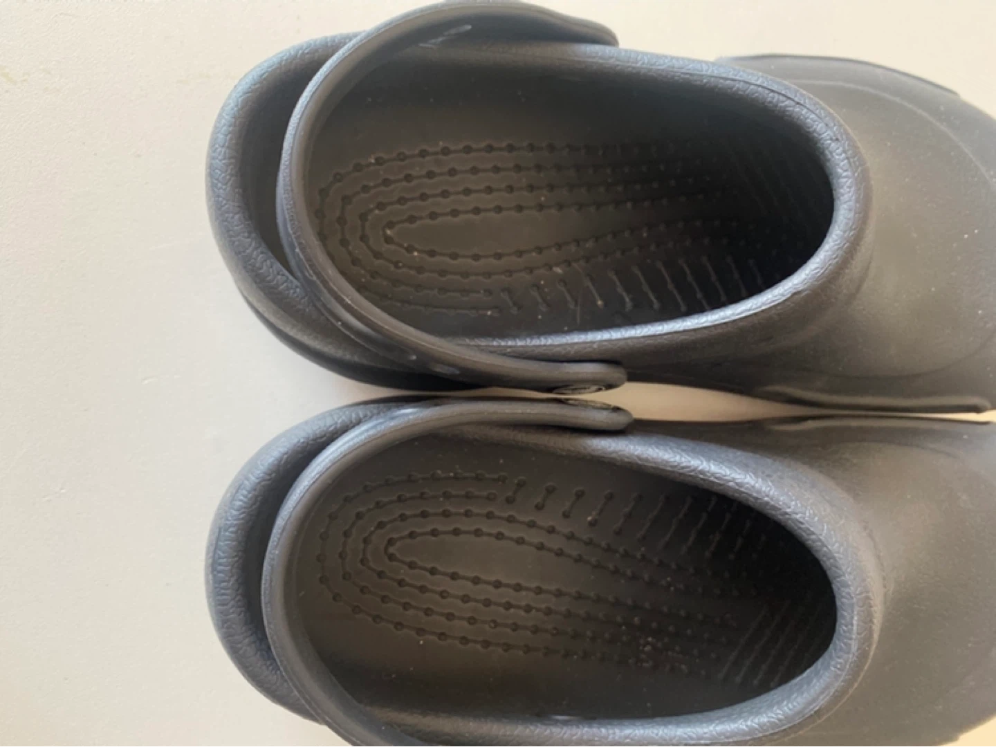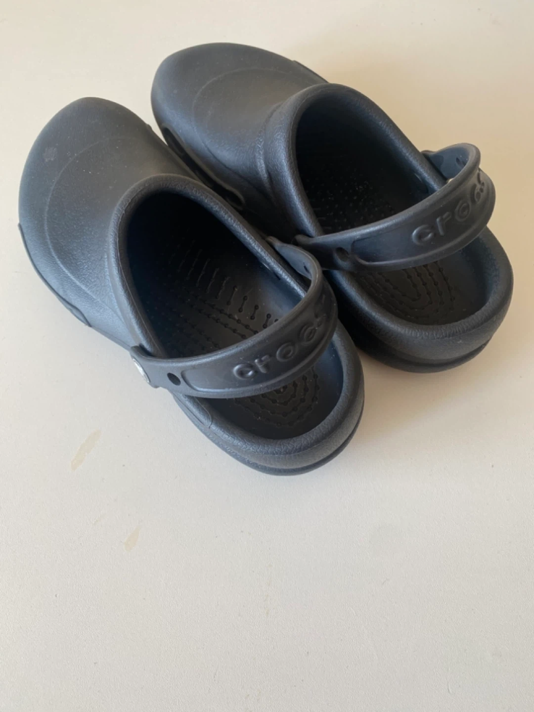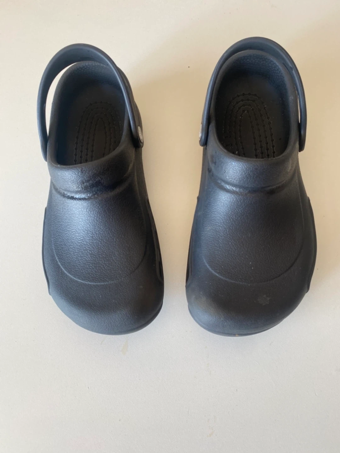 Black Crocs slip-on shoes. These are a size 8. They're made in Vietnam. Excellent non-slip soles for work environments.